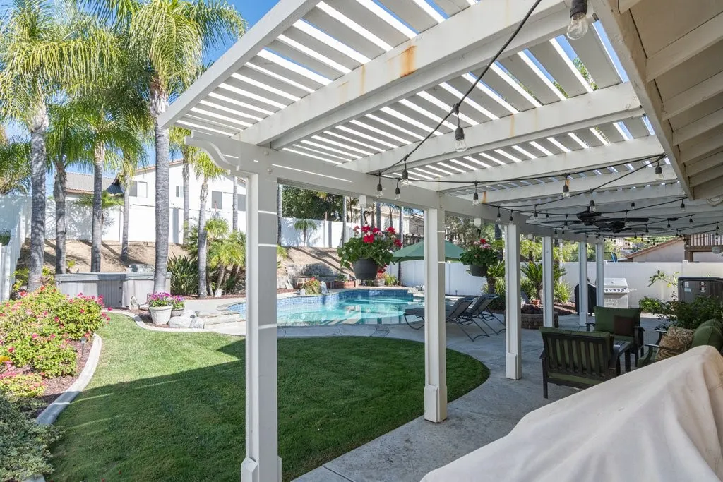 Absolutely stunning 4 bedroom 2.5 bath pool home with a 3 car garage. The details in this house are eye catching. Beautiful luxury vinyl plank flooring and upgraded baseboards throughout the main floor. The kitchen boasts shaker cabinets, pendant lights, a large pantry and granite counters. The primary bathroom was remodeled and has a stand alone tub. 4th bedroom/office has built in cabinets. Cased windows. Vinyl fencing around the whole yard. The back yard has a beautiful pool and above ground hot tub. Lattice covered patio with space for seating. Quiet cool whole house fan. There is a solar lease that will need to be assumed. There is no HOA. In the award winning Temecula Valley Unified School District. Minutes from shopping, Pechanga and freeway access. View of Mount Palomar. Low tax rate.