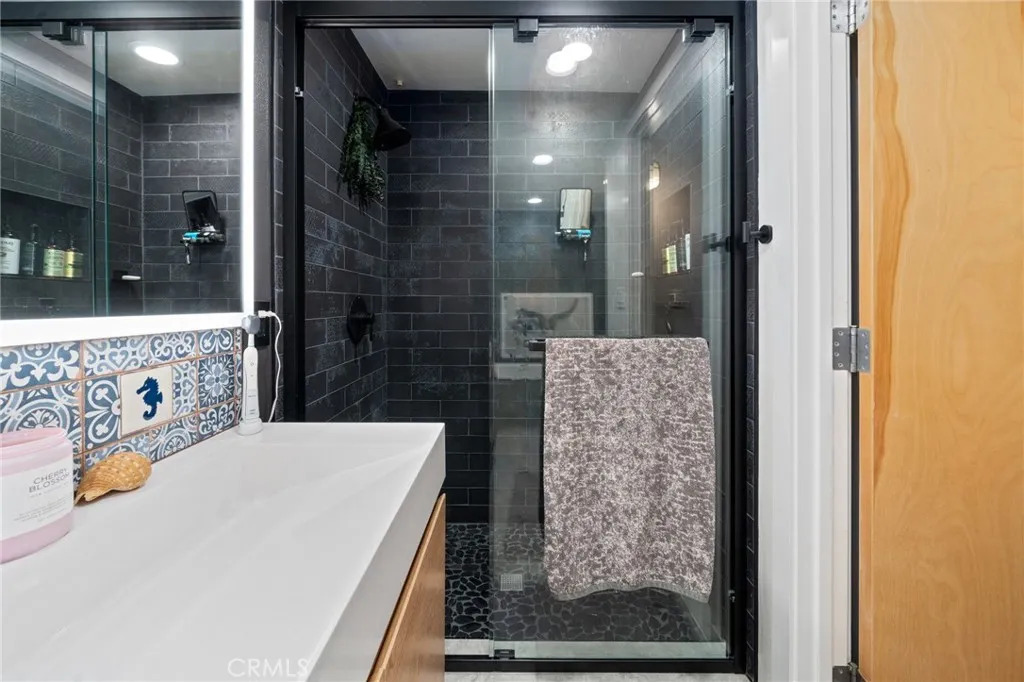 The downstairs bathroom features a walk-in shower and a generous soaking tub, creating a spa-like retreat. Both bathrooms have been thoughtfully upgraded with modern finishes that complement the building’s historic architecture without competing with it.