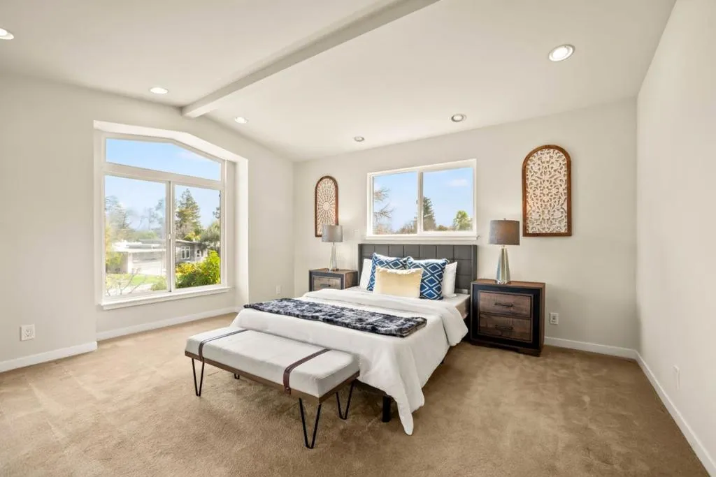 Full of natural light. Tall ceilings. Paid solar. Located in a highly desirable Palo Alto neighborhood just moments from Mitchell Park, Ramos Park, and everyday conveniences. Soaring ceilings welcome you into bright, inviting living spaces designed for comfort and flexibility. The thoughtful floor plan includes a full bedroom and bath on the main level, ideal for guests, extended family, or a private office. The open-concept kitchen offers abundant cabinetry and storage, flowing seamlessly into the living and dining areas. A separate family room- easily used as the fourth bedroom- is outfitted with home theater equipment, perfect for movie nights or relaxing at home. Upstairs, you will find two spacious bedrooms, each with its own private bath. Enjoy effortless indoor-outdoor living as the living room opens to a beautifully landscaped backyard featuring a variety of fruit trees, garden beds, and a large storage shed. Well-proportioned rooms, a functional layout, and an inviting atmosphere make this home truly move-in ready. Ideally located with easy access to major commute routes and near leading tech campuses including Google, Meta, Amazon, and LinkedIn. Close to parks, shopping, dining, and highly regarded Palo Alto schools including Gunn High.
