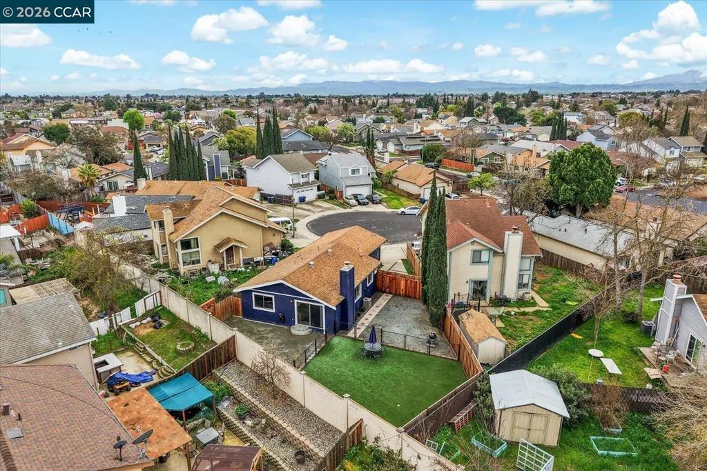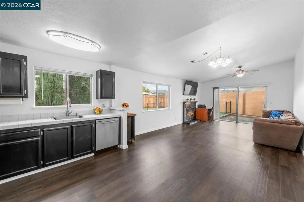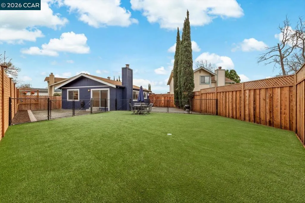 This 2 bed, 1 bath single family home offers 1,013 sq ft of opportunity for first time buyers, investors, or contractors ready to build equity through thoughtful improvements. With a functional layout and key updates already completed, it is a solid foundation for customization and long-term value. Inside, an open concept kitchen and living room features a slanted ceiling and brick woodburning fireplace that anchors the space. A sliding glass door creates seamless indoor-outdoor flow to the low maintenance backyard. Vinyl plank flooring runs throughout for durability and easy care, while ceiling fans in multiple rooms add comfort. The home includes two bedrooms and a full bath with shower over tub and vanity. A two-car garage offers generous shelving, plus additional attic storage. The fully fenced yard is designed for easy upkeep with artificial lawn. Recent upgrades include chain link fencing, a redwood front fence and gate, and electrical updates. Located minutes from Downtown Oakley, shopping, schools, parks, and freeway access, this is a renovation project with upside, delivering both convenience and potential – make your mark!