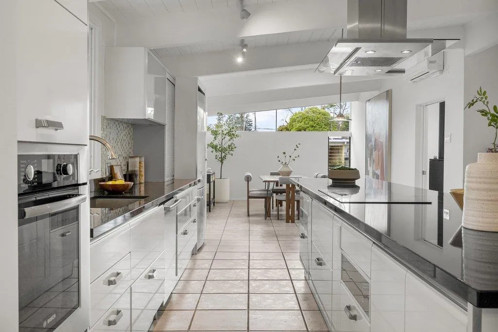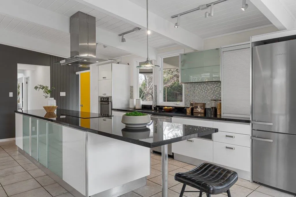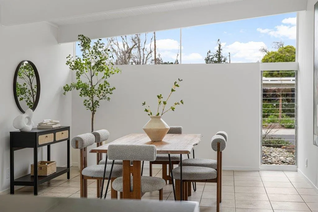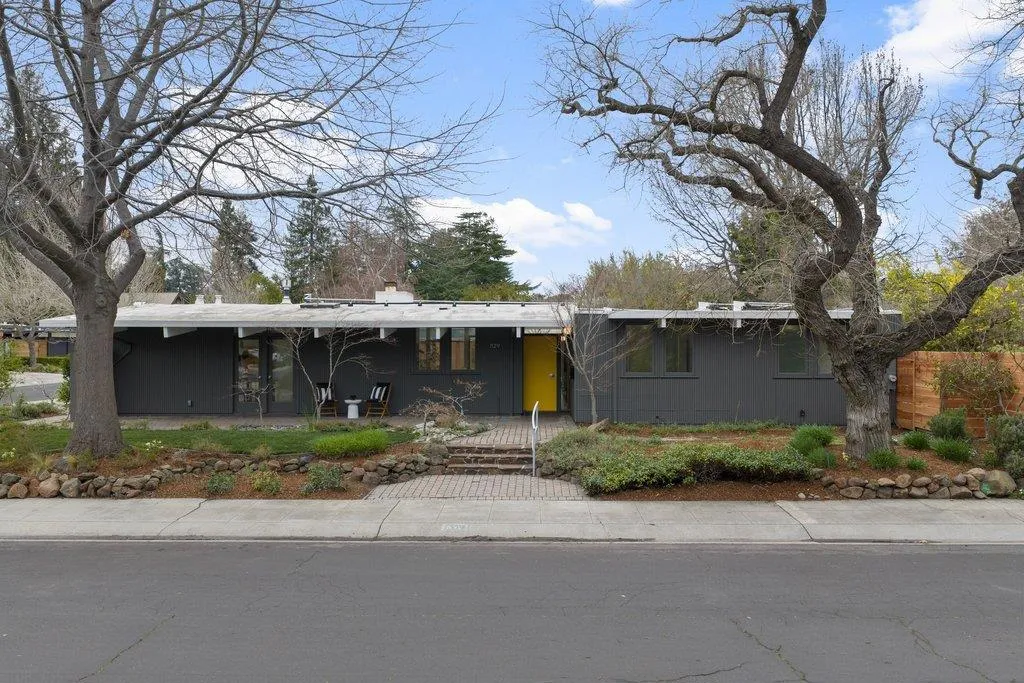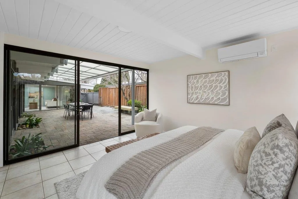 Stunning remodeled Eichler in sought-after Palo Verde. This 4BR/2.5BA home offers 2,098 SF of light-filled living on a tastefully landscaped 8,028 SF lot, blending classic mid-mod design with modern updates. Signature features include floor-to-ceiling glass, exposed beams, and tongue-and-groove ceilings. Inviting curb appeal with interlocking brick walkway and driveway. The spacious great room with iconic corner fireplace flows into a sleek contemporary kitchen with Scavolini cabinetry, black granite counters, oversized island with aluminum and frosted glass accents, Bosch cooktop, oven, and Miele refrigerator. Separate family room with skylight, Jotul gas freestanding stove, powder room, laundry, and large slider to patio for seamless indoor-outdoor living. The primary suite features barn-door access to the walk-in closet and bath, stall shower, and yard access. Hall bath offers dual vessel sinks and tub/shower combo. Amenities include five new mini-splits, upgraded 200-amp panel, foam roof, updated light fixtures, custom aluminum and frosted glass closet doors, and fresh interior/exterior paint. Private backyard with custom overhang, built-in curved bench, spa, and mature ornamental plantings. Prime location near YMCA, swim & tennis club, tech, and top Palo Alto schools.