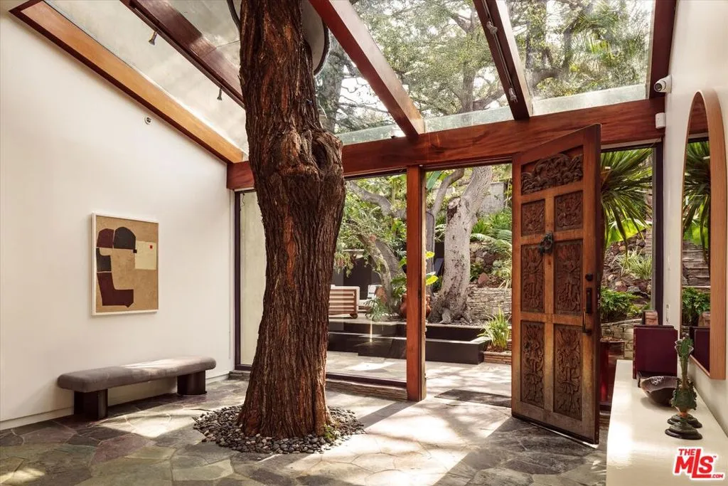 A striking architectural retreat perched at the top of Laurel Canyon, 8882 Lookout Mountain sits across four contiguous lots surrounded by mature trees, offering exceptional privacy and sweeping canyon-to-mountain views. Upon entering you are greeted with a dramatic living room where indoors and outdoors merge seamlessly, anchored by a mature tree growing through the space, and framed by skylights that filter soft light through its canopy. Floor-to-ceiling steel windows capture expansive views throughout. The chef's kitchen features stainless counters and island, custom cabinetry, and premium appliances, flowing effortlessly into the formal dining room with fireplace. Two additional bedrooms complete this level, one currently styled as a den. The primary suite occupies its own level, creating a true private retreat with a fireplace, walk-in closet, spa bath, and a retractable soaring ceiling. The lower level offers a bedroom, bath, kitchenette, sitting area, and gym ideal for guests, creative studio use, or extended living. The outdoor spaces are equally transporting, with layered decks and patios, an outdoor lounge complete with a pizza oven, and a pool with built-in spa, a sauna, and cold plunge, all set against breathtaking canyon views. With a separate garage, four total parking spaces, abundant natural light, and bold architectural presence, this is a rare hillside compound where design, privacy, and nature converge.