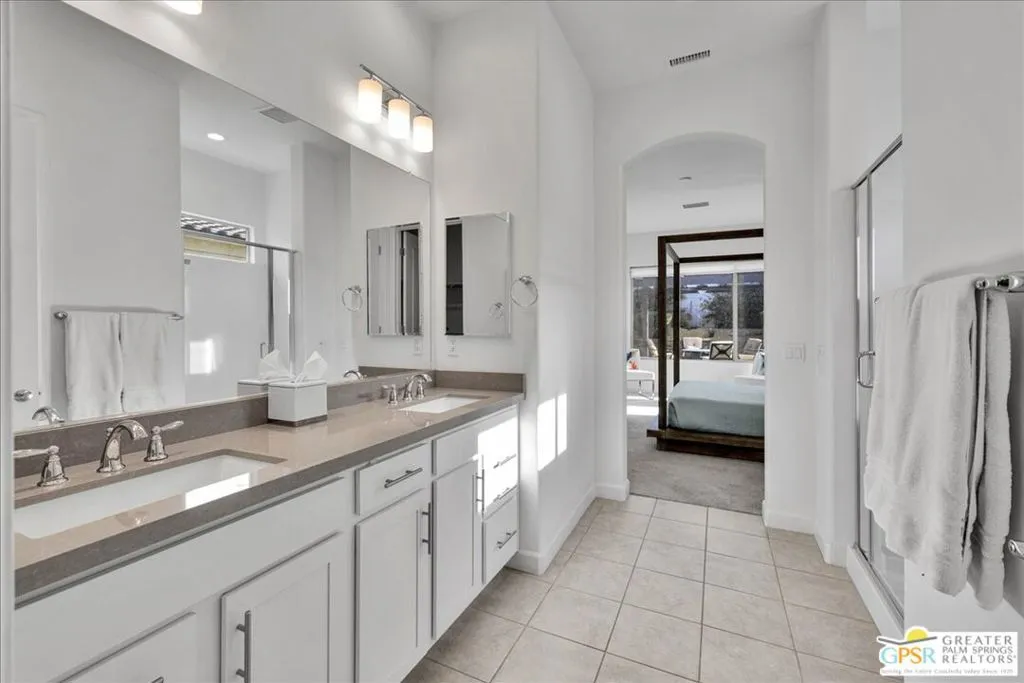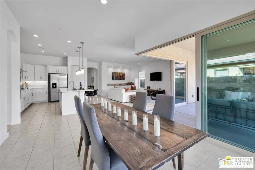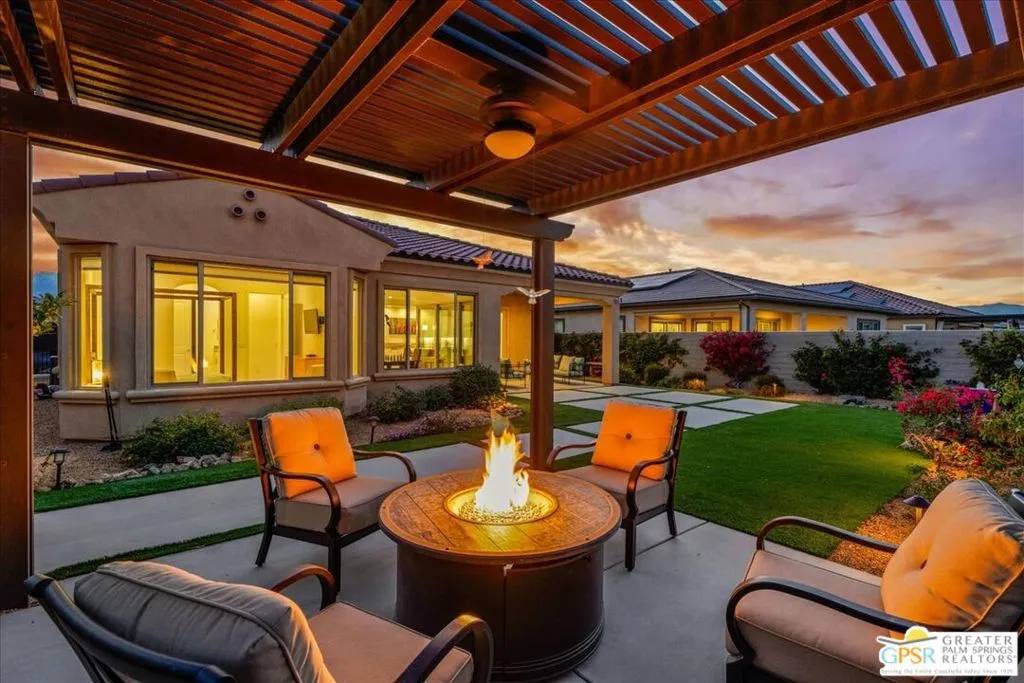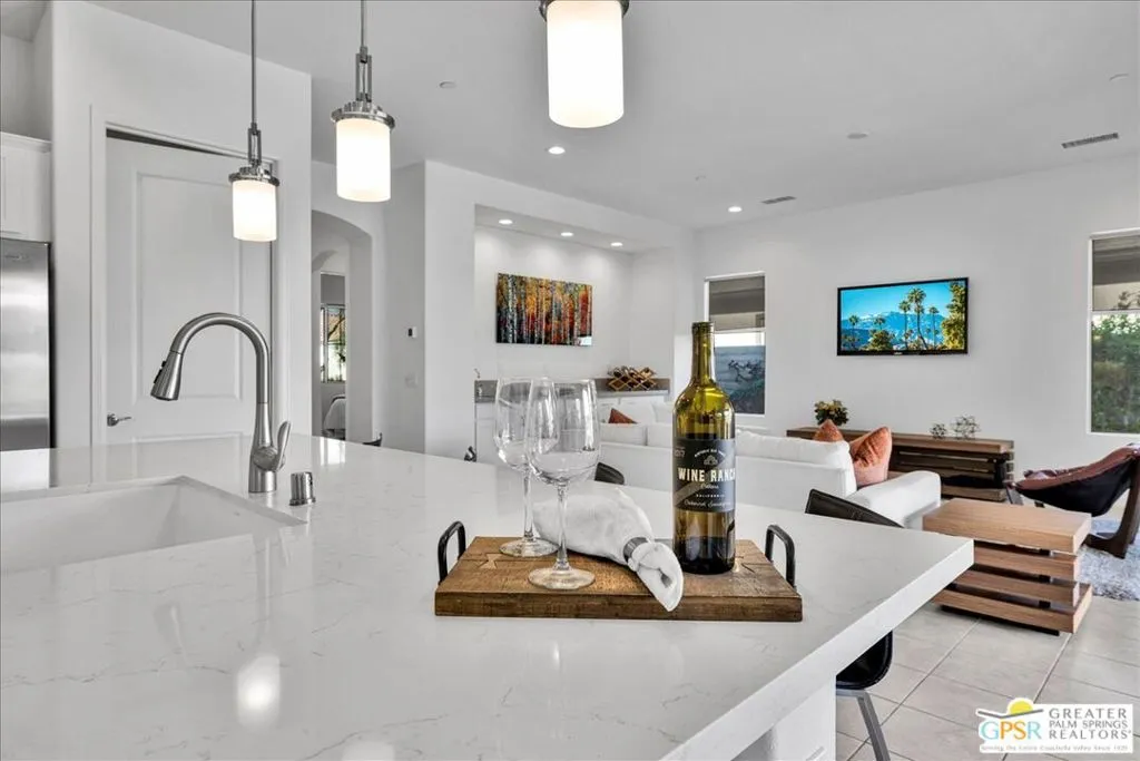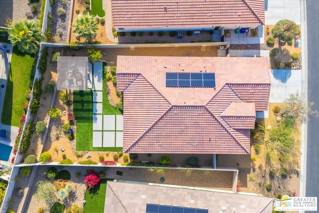 Welcome to this beautifully expanded Phase 3, Plan 4 Sanctuary in the highly desirable 55+ community of Del Webb Rancho Mirage. Offering 2 bedrooms, 2 baths, plus a versatile den/flex space, this light-filled residence blends thoughtful upgrades, architectural charm, and seamless indooroutdoor living. From the moment you enter, you'll appreciate the expanded tile flooring, custom roller shades, and the sought-after arch package that adds warmth and character throughout the home. The kitchen is both elegant and highly functional, featuring quartz countertops, brushed nickel hardware and fixtures, pendant lighting, and a generous island with ample seating - perfect for gathering and entertaining. The space opens beautifully to the dining and great room areas, enhanced by upgraded LED lighting, a stylish WET BAR with granite countertops and abundant cabinetry, and the highly coveted SIX-PANEL SLIDING GLASS DOOR SYSTEM that creates a true indooroutdoor connection. The EXPANDED PRIMARY suite offers the desirable bay window option, adding additional square footage and natural light. The ensuite bath is thoughtfully appointed with gray quartz countertops, upgraded lighting, modern brushed nickel fixtures, a spacious stall shower with bench seating, and generous closet storage. Positioned on the opposite side of the home for added privacy, the guest bedroom enjoys convenient access to a full bath with tub - ideal for visiting friends and family. The den/flex space, currently styled as an office, offers flexibility as a media room, fitness space, or creative retreat. Step outside to a generous POOL SIZED BACKYARD designed for both relaxation and entertaining. The covered patio extends to expanded hardscape and mature landscaping, complemented by a soothing bubbling water feature and a large pergola with ceiling fan and ambient lighting - all framed by BEAUTIFUL MOUNTAIN VIEWS. Additional highlights include leased SOLAR ($66.16Mo), a tankless water heater, and a laundry room with washer and dryer. Located within the prestigious Del Webb Rancho Mirage community, residents enjoy access to a state-of-the-art clubhouse, resort-style pool and spa, fitness center, tennis and pickleball courts, and a vibrant social calendar. HOA dues include cable and internet, adding even more value to this exceptional home. A sophisticated, move-in-ready opportunity offering comfort, style, and the very best of desert resort living.