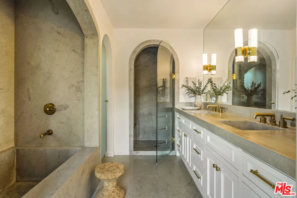 Set along a quiet rise in Los Feliz, this 1926 Spanish Colonial balances historic character with thoughtful, material-driven updates. Lime-washed walls by Portola and soft tones from Farrow & Ball create a sense of calm continuity throughout, while quartzite and limestone surfaces, paired with Waterworks fixtures, bring depth and quiet durability to the kitchen and bathrooms. The interior unfolds naturally from one space to the next. An arched living room opens to a light-filled dining area overlooking the garden and distant skyline, while upstairs suites connect to private marble-tiled terraces finished in Zia stone, with views stretching toward Griffith Observatory and the surrounding hills. On the lower level, a screening room, guest quarters, and sauna offer a more relaxed retreat for evenings in or hosting. Outside, landscapes by Terremoto shape the grounds into a series of usable moments. Redwood decking, native plantings, edible gardens, and a cedar soaking tub are nestled into the hillside. Moments from Los Feliz Village, The Greek Theatre, and Griffith Park, the setting delivers a rare balance of neighborhood intimacy and access to Los Angeles' most enduring natural and cultural landmarks. Extensive system upgrades include a restored clay tile roof, tankless hot water, air purification, dual-pane wood windows, and fully integrated smart home infrastructure.