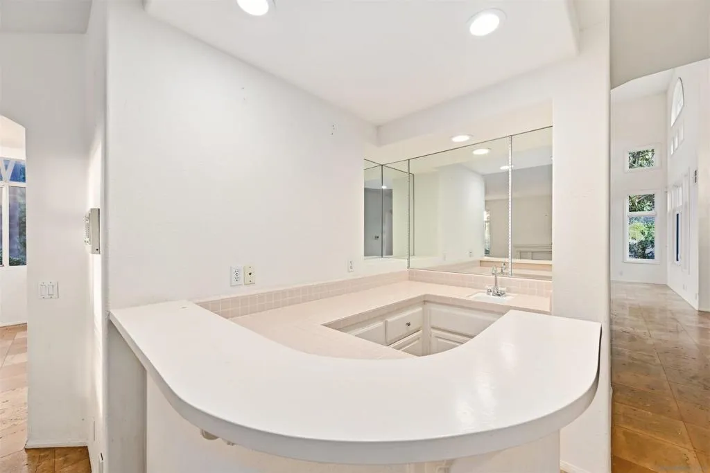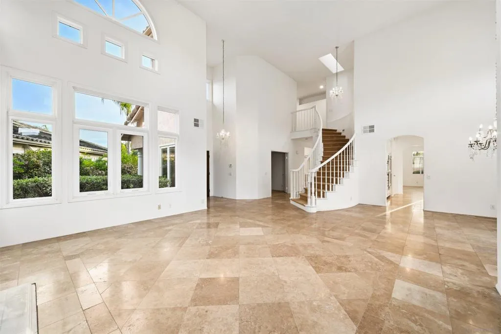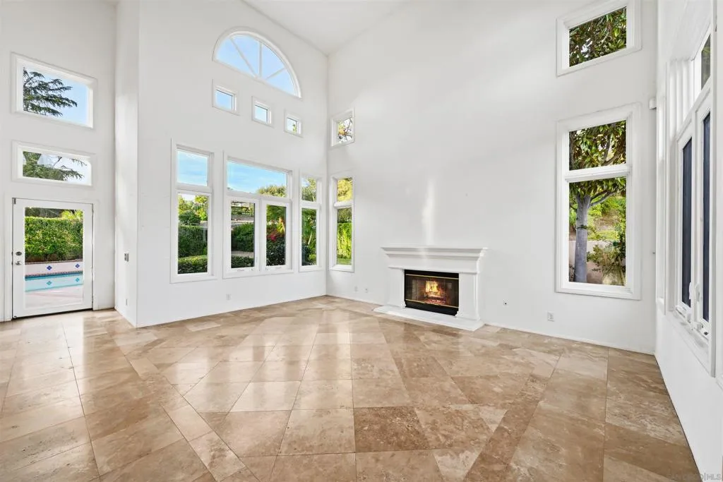 Rarely available and the largest floor plan in this gated enclave, this exceptional residence sits at the end of a cul-de-sac on one of the community's most private lots, reached by an extra-long driveway that enhances both presence and seclusion. Inside, a grand entry and sweeping curved staircase rise beneath soaring ceilings, creating a striking first impression of elegance and scale. Walls of windows fill the formal living and dining areas with natural light, setting the stage for memorable gatherings. The chef's kitchen is designed to inspire, featuring abundant cabinetry, quartz countertops, a 6-burner gas cooktop, walk-in pantry, and an extended garden window that bathes the space in sunshine. Adjacent, the inviting family room offers a cozy fireplace and wet bar—perfect for entertaining. The main level also includes a generously sized bedroom with en suite bath and a spacious laundry room. Upstairs, the expansive primary suite is a true retreat, highlighted by a two-sided fireplace that adds warmth and ambiance to both the bedroom and spa-like bath. Secondary bedrooms are well-appointed with convenient bathroom access. Meander outside to a resort-style backyard designed for relaxation and celebration, complete with a sparkling pool with diving board and attached toddler/play pool, plus a built-in BBQ. Ideally located just minutes from North County Fair Mall, Kit Carson Park, and Lake Hodges, with easy access to major commuter routes, this home perfectly blends luxury, comfort, and convenience.