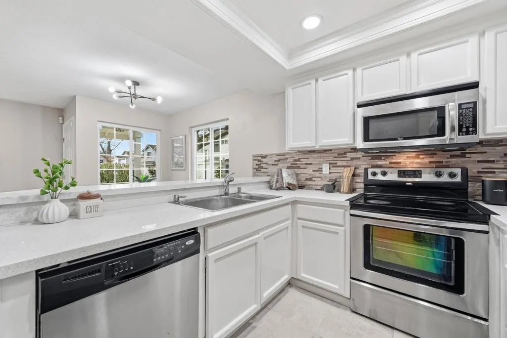 Bright and cheerful end unit in the desirable Gables community, offering the privacy and feel of a single-family home with top rated Ardenwood school districts. Open floorplan with a bright living room creates an inviting and airy atmosphere. Move-in ready with thoughtful upgrades throughout, including quartz kitchen countertops, granite counters in all bathrooms, stainless steel appliances, new light fixtures, and freshly painted bathroom vanities. The spacious primary suite features a walk-in closet and a versatile retreat perfect for a nursery, office, workout area or den. Double-pane windows, recessed lighting, and a skylight in the second-floor hallway bring in abundant natural light. Attached side by side two-car garage for convenience. The charming front yard deck with a white picket fence creates a welcoming outdoor space. Excellent interior location within the community-quiet and away from street noise. HOA covers water, hazard insurance, and exterior maintenance. Ideally located near parks and Ardenwood schools with easy access to Facebook, Hwy 84 and 880.