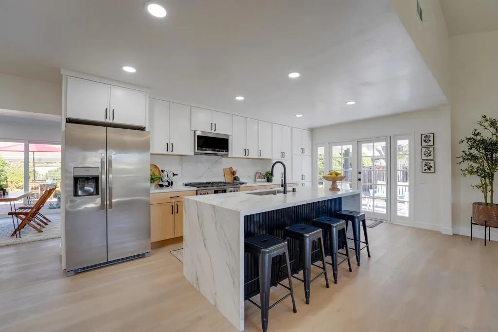 Welcome to this completely remodeled spacious home that pairs fresh, modern finishes with the charm of distinguished Rancho Bernardo. Set on a quite cul-de-sac with an oversized lot and views of the local mountains. Inside, you will find 3 bedrooms and 2 baths with a bonus room which could be used as a 4th bedroom, office or den. The home boasts open concept living with high vaulted ceilings in the living room, kitchen island with waterfall edges, custom kitchen cabinets, and brand new stainless steel appliances. Multiple french and sliding doors bring the outside in. Perfect for relaxing, gardening and entertaining. Conveniently located minutes from the Seven Oaks community center which includes pickleball, a fitness center, pool, community events and much more. This is a must see!