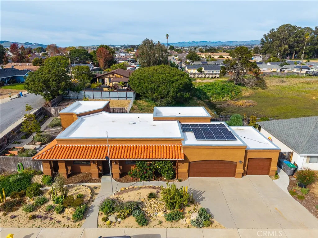 Rare opportunity combines income, sustainability, expansion potential & flexible living on this ultra energy-efficient property! Just two blocks from Arroyo Grande in Oceano, corner lot adds privacy/extra parking. Lovely 3 bed/2 bath home includes paid-for, ultra-efficient solar system and quality construction rarely found at this price point. 3-car garage, drought-resistant landscaping throughout, raised flowerbeds for vegetables, and 12–13 young fruit trees (apple, apricot, orange, etc.). Living room & great rooms with 11-foot ceilings. Remodeled by local contractor in 2023 with long-term durability in mind, home presents low risk for deferred maintenance surprises and outstanding long-term energy efficiency. Unlock ONE hallway door, and home easily converts from 3 bed/2 bath home to 2 bed/1 bath home w. Studio/1bath ADU - separate entrance/garden leased til Dec 2026. ADU has cherry-wood kitchen cabinets/granite counter tops. Kind, respectful tenant shares washer/dryer access via garage. ADU lease of $1770/mo ends Dec 2026; includes utilities & single-car garage, but NOT driveway. Income options: Live in main house, or ADU. Rent main house at approx. $3000+ per month (buyer to verify market rents), while living in the ADU (once tenant leaves). Increase income further: add/rent another RV, Mobile Home or ADU on extra rear lot (buyer to verify with county/city)! Sewer/water in place. Extra lot fenced off from main-house yard, with separate street access. Previously used for RV rental, and big social gatherings. Energy Perks: Uses under 1/3 of avg. local energy consumption, saving $300/month (buyer to verify). Pre-wiring allows easy future conversion to all-electric living, including EV charging capability & compatibility w. 120V heat-pump water heater technology. 4kW Solar System -online monitoring, no battery. Commercial-grade Mitsubishi 2-zone mini-split heat pump system (ducted in main house, ductless in ADU) All-metal ducting (rare upgrade for durability/efficiency) R-60 insulation in main house & R-50 blown attic insulation (far above standard) 2022 commercial-grade TPO white membrane roof covering, with R-4 above-deck insulation, new parapet flashings, upgraded underlayment, and tile reset by SLO County Roofing.Exceptional options if wish to: simplify/cut living expenses, add income with rental options & prepare to have others separate yet close in ADU (e.g. use 3-bed. home until wish to pare down and buyers move into ADU themselves).