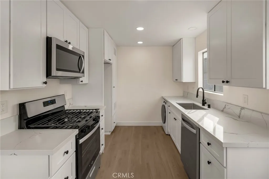 Welcome to the city of Artesia! Situated within the highly desirable ABC Unified School District, this nicely updated 2-bedroom home offers a functional layout and thoughtful updates throughout. A welcoming front lawn and walkway that lead up to the home's main entry. The home opens into a connected living and dining area, creating a comfortable and perfect layout for hosting. New flooring and fresh interior paint continue throughout the space, providing a bright and refreshed feel. The dining area flows seamlessly into the updated kitchen, which features recessed lighting, stainless steel appliances, and an integrated washer and dryer. A side door off the kitchen provides direct access to the driveway, which extends to a detached two-car garage at the rear of the property. The home offers two well-sized bedrooms and a bathroom conveniently located off the living area. A backyard with a generous lawn provides additional outdoor space for relaxation or entertaining. Take a look at it today before it's too late! To help visualize this home’s floor plan and to highlight its potential, virtual furnishings may have been added to photos found in this listing.