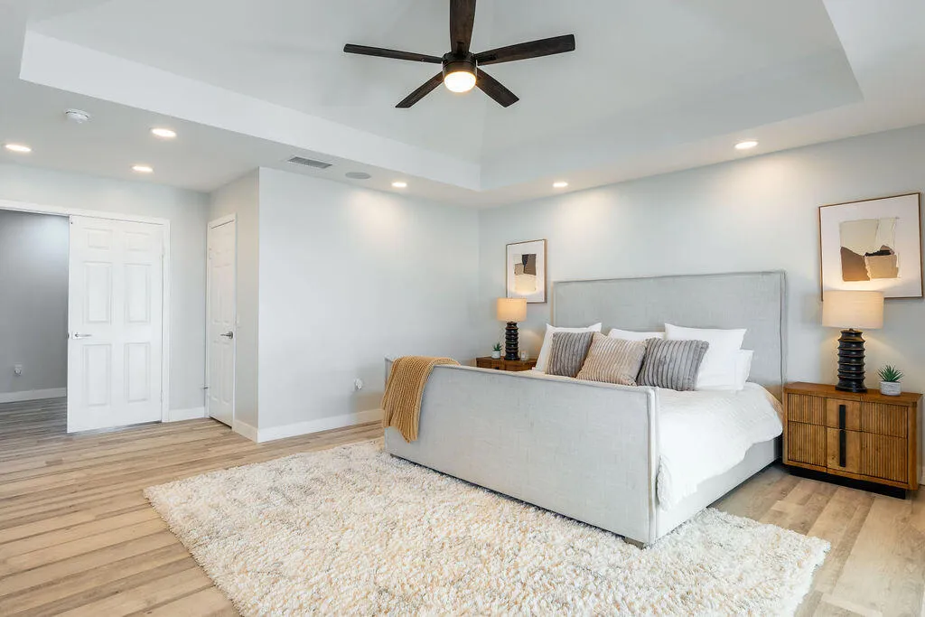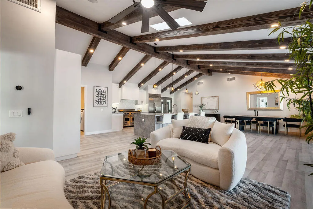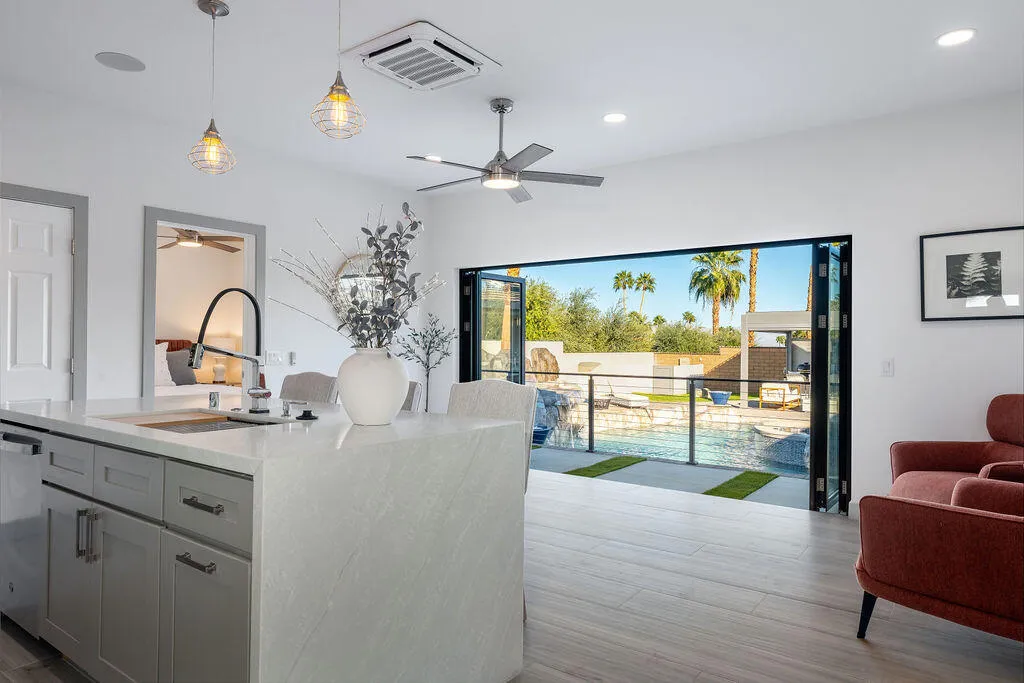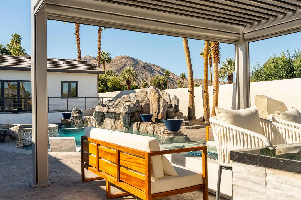 Completely rebuilt and reconfigured, this exceptional 3,190 sq. ft. residence was taken down to the studs and transformed during a meticulous three-year renovation. Nearly every square inch has been upgraded, creating a modern desert retreat with high-end finishes throughout.The showpiece kitchen features a dramatic 12-foot quartz island with dual waterfall edges, double faucets, and an oversized 5-foot sink. Premium appliances include a 48'' Sub-Zero refrigerator and 48'' Viking double-oven range. Custom wood beams with integrated lighting span the kitchen and living areas, adding warmth and architectural character to the open-concept design. Expansive views immediately draw you to the backyard oasis.The home offers five bedrooms and five bathrooms, including two luxurious primary suites. The main primary retreat features vaulted ceilings with decorative wood beams and lighting, a fireplace, and bifold patio doors opening to the outdoors. The spa-inspired bath includes a fully tiled wet room with soaking tub and rain shower. A spacious walk-in closet is conveniently located adjacent to the bath.The second primary suite offers a raised ceiling, large walk-in closet, and bath with double-sink vanity, walk-in shower, and new two-person Jacuzzi tub.Upgrades include new plumbing and electrical, new HVAC systems, tankless water heater, all new doors and windows, and a completely re-stuccoed exterior. The three-car garage features new aluminum doors and upgraded flooring.The backyard is a true private resort with a newly built PebbleTec pool and spa, waterfall grotto with slide, and three fire-water features. An adjustable aluminum patio cover and a fully equipped outdoor kitchen with built-in BBQ, refrigerator, warming drawer, sink, Kamado grill, and fire pit lounge area make entertaining effortless.Completing the property is a brand-new detached casita with its own private street entrance. Finished with high-end materials and thoughtful design, it features a full kitchen, washer and dryer, walk-in closet with built-ins, and complete privacy. Whether used for guests, extended family, or a private retreat, this space truly elevates the property--and is arguably one of the most impressive features of the home.This is not simply a remodel--it's a complete transformation into a modern luxury desert compound.