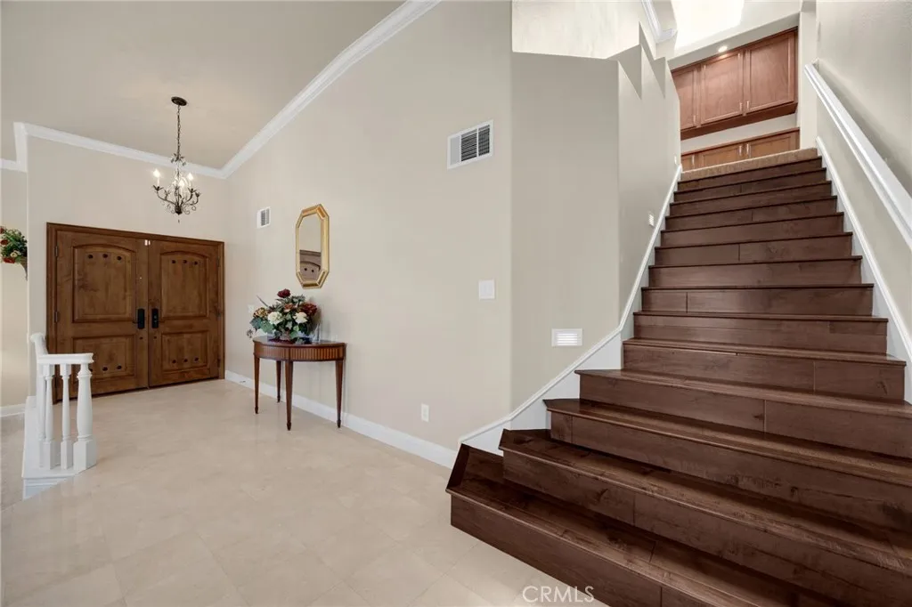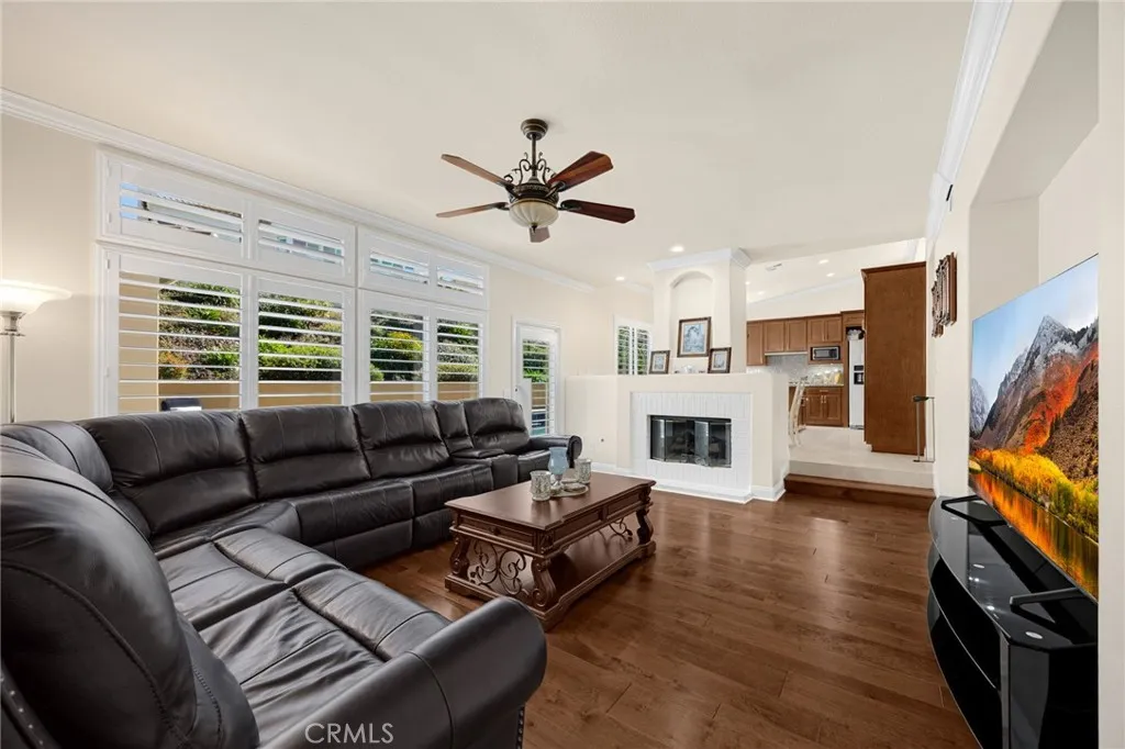 Welcome to Luxury Living in La Verne Heights! This impeccably upgraded 4-bedroom, 3-bathroom home in the prestigious gated community of La Verne Heights offers approximately 2,735 sq ft of refined living paired with a stunning resort-style backyard. Enter through elegant double doors into a warm living room that flows seamlessly into the formal dining area—perfect for everyday living and entertaining. The adjacent gourmet kitchen features top-of-the-line appliances, generous counter space, and a large quartz natural stone island, opening to the inviting family room with fireplace and built-in entertainment center. A convenient downstairs bedroom sits near a full bath and laundry room, ideal for guests or multi-generational living. Upstairs, the serene primary suite provides a private retreat with plush carpeting, crown molding, and a spa-inspired bath with dual vanities, soaking tub, and separate shower. Two additional spacious bedrooms share a dual-vanity hall bath, and the versatile loft is perfect for a home office, den, or play area. Pride of ownership shines throughout with a high-efficiency solar system, custom paint, upgraded lighting, rich hardwood flooring, and extensive crown molding. Step outside to your private oasis designed for year-round enjoyment. The breathtaking backyard features a saltwater Pebble Tec pool and spa, expansive decking, lush illuminated landscaping, and automatic sprinklers. The oversized gazebo is fully equipped with a fireplace, lighting, space heaters, and surround sound, while the adjacent BBQ center offers additional quartz countertops and a built-in refrigerator. Completing this exceptional home is a three-car garage with state-of-the-art epoxy flooring and abundant custom storage. A true must-see that perfectly blends luxury, comfort, and resort-style living.