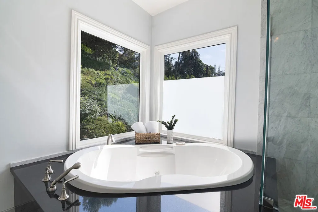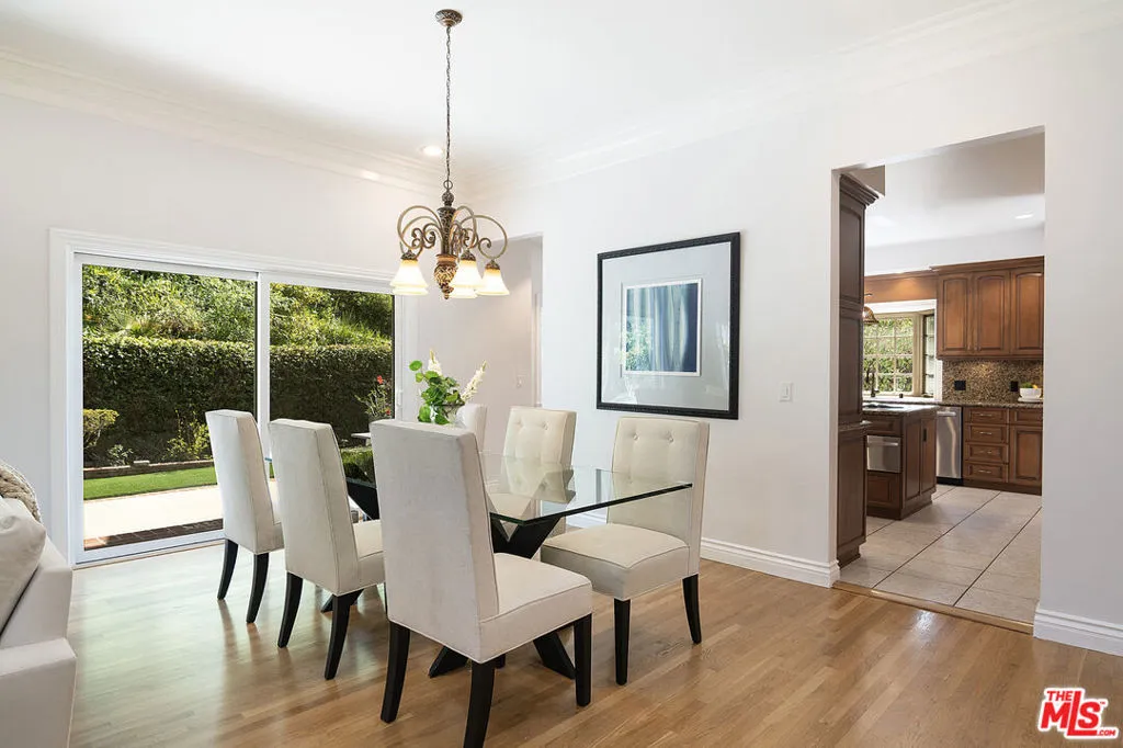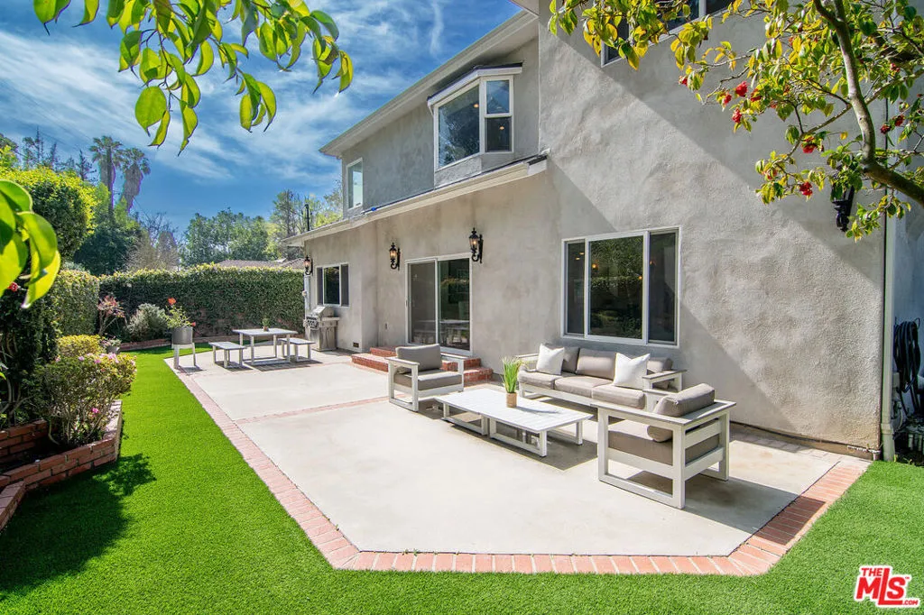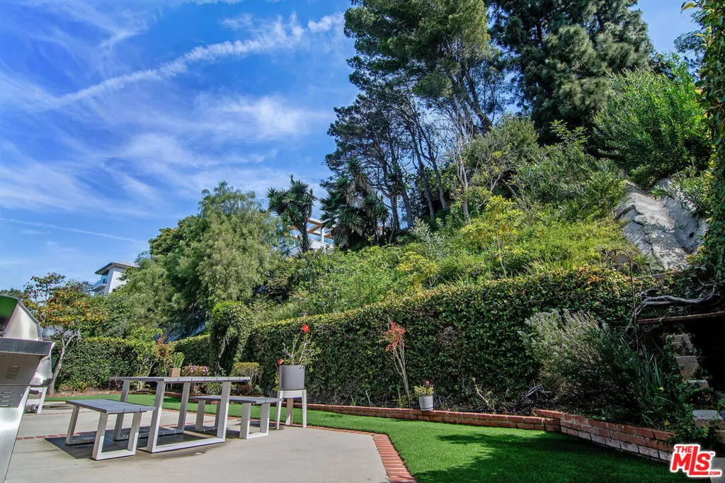 This single-family residence graces a tree-lined stretch of Castle Heights Avenue in the coveted Beverlywood Homes Association. Spanning 2,813 square feet on a generous 10,200-square-foot lot, it delivers a compelling blend of classic appeal and contemporary flow. The traditional faade extends a warm welcome from the street. Step inside to a distinguished living room where built-in cabinetry, a working fireplace, and skylight create an airy, light-filled introduction to the home. The kitchen commands attention with its impressive scale and thoughtful design: abundant counter space and cabinetry, an extra-large island featuring a second sink, a powerful 6-burner chef's range with grill and double oven tucked into a cabinetry nook with hood vent, a warming drawer, a bar fridge, and a relaxed eat-in area that draws the eye to the serene rear grounds. The dining room and family room unite in an expansive, high-ceilinged space wired for surround sound, where the layout feels naturally inviting and opens directly to the backyardperfect for seamless indoor-outdoor living and entertaining. Upstairs, the master suite unfolds as a private sanctuary with a dedicated lounge and separate office, plus a spacious bedroom that enjoys tranquil views across the backyard and lush hillside. A generously proportioned walk-in closet offers custom built-ins, while the master bath provides spa-level comfort: separate shower, jetted tub, double vanity, heated floors, and towel warmer. Downstairs, one wing accommodates two bedrooms sharing a full bath and heated floors, while the opposite wing presents a versatile fourth bedroomideal as a guest suite or officewith street-facing views and its own attached three-quarter bath. The backyard offers rare outdoor privacy: a broad patio flows to a turf area, all embraced by a substantial, lush hillside of dense greenery that ensures remarkable seclusion and calm. A thoughtfully updated home with genuine scale and character, quietly positioned in one of LA's most sought after neighborhoods.