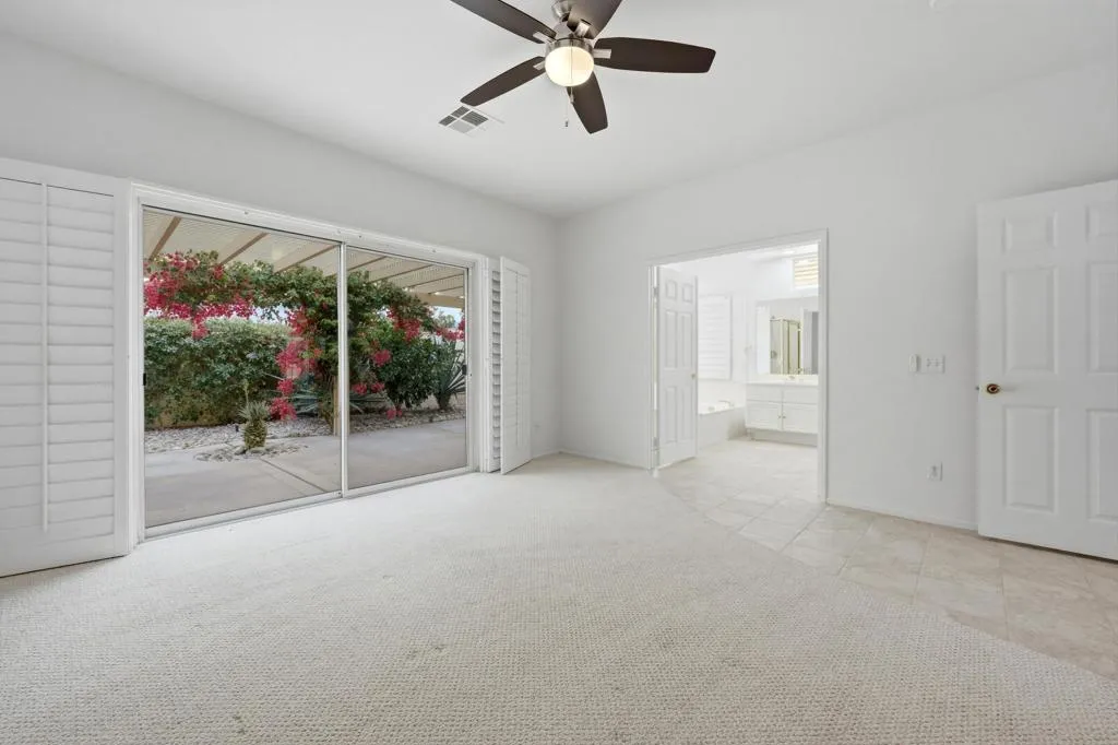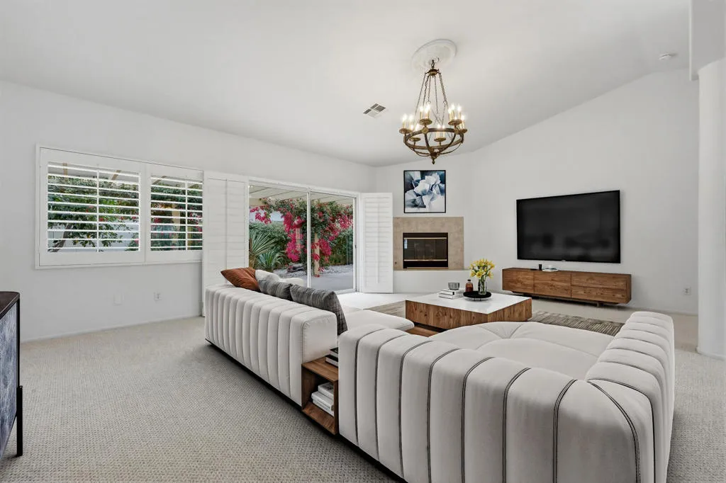 Welcome to this beautifully maintained 3 bedroom, 2 bath home in the highly desirable Bella Vista neighborhood of La Quinta, just minutes from the renowned Indian Wells Tennis Garden, charming Old Town La Quinta, and a short drive to the upscale shopping and dining of El Paseo. With a very low HOA, this home offers exceptional value in one of the desert's most sought-after communities. From the moment you enter the newly painted interior, you are greeted by an inviting open floor plan filled with natural light. The spacious living room features soaring ceilings, a cozy fireplace, and sliding glass doors that open to the patio, seamlessly blending indoor and outdoor living. An adjacent dining area creates the perfect setting for both everyday comfort and entertaining. The primary suite is a serene retreat, complete with sliding doors to the patio and an ensuite bathroom offering dual sinks, a soaking tub, a separate shower, and a generous walk-in closet. Two additional bedrooms provide ample closet space, with one ideally suited for a guest room or home office. A well-appointed hallway bath with a bathtub serves these rooms.The bright and welcoming kitchen features a breakfast bar, gas cooktop, built-in double oven, freshly painted wooden cabinetry, and a sunny morning room with patio access. In May of last year, an energy-efficient, quality-brand refrigerator and microwave were installed, adding modern convenience and value. Just off the kitchen is a full-sized laundry room with washer, gas dryer, utility sink, and storage cabinets, along with direct access to the two-car garage. One of the home's most valuable upgrades, especially in the desert climate, is the high-efficiency Bryant Preferred(tm) newer air conditioning system installed less than a year ago. This dependable and efficient upgrade offers peace of mind, and lower energy bills. Throughout the home, elegant plantation shutters adorn every window and sliding door. The backyard is designed for relaxed desert living, featuring low-maintenance landscaping, a relaxing fountain, a concrete patio, a spacious storage shed with shelving, and convenient RV parking for your recreational needs. Additionally, electricity is provided by Imperial Irrigation District (IID), known for lower utility rates compared to surrounding providers. This lovingly cared-for home shines with pride of ownership. Come experience desert living at it's finest!