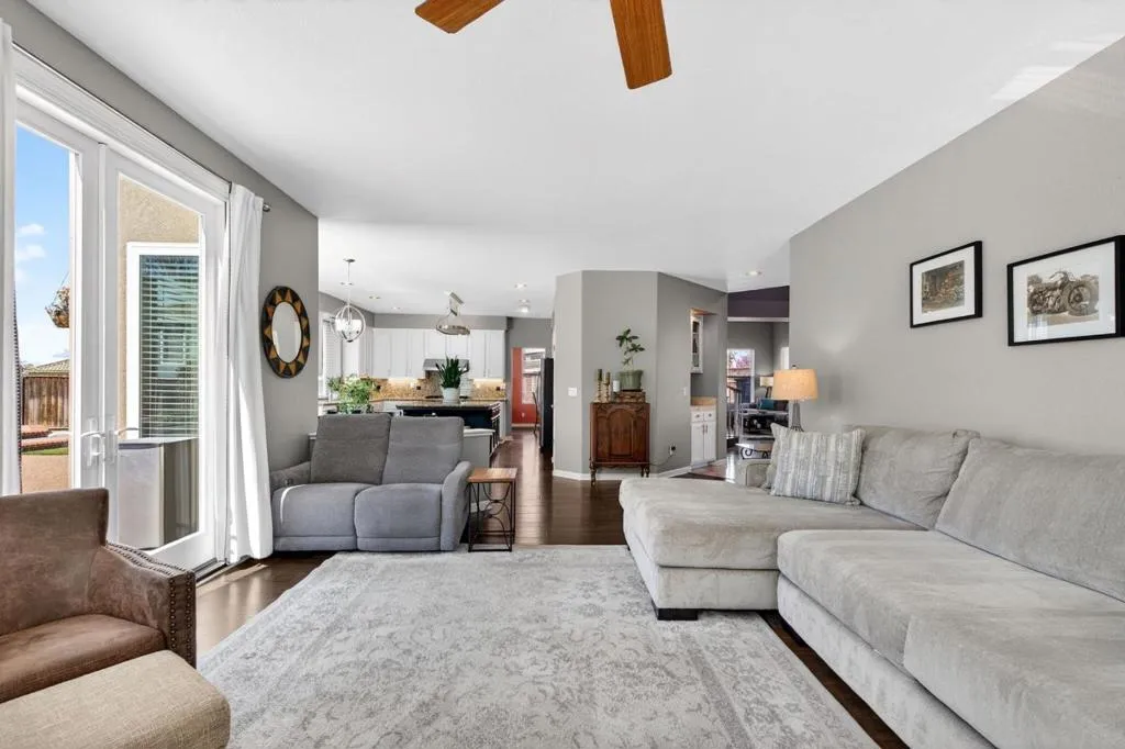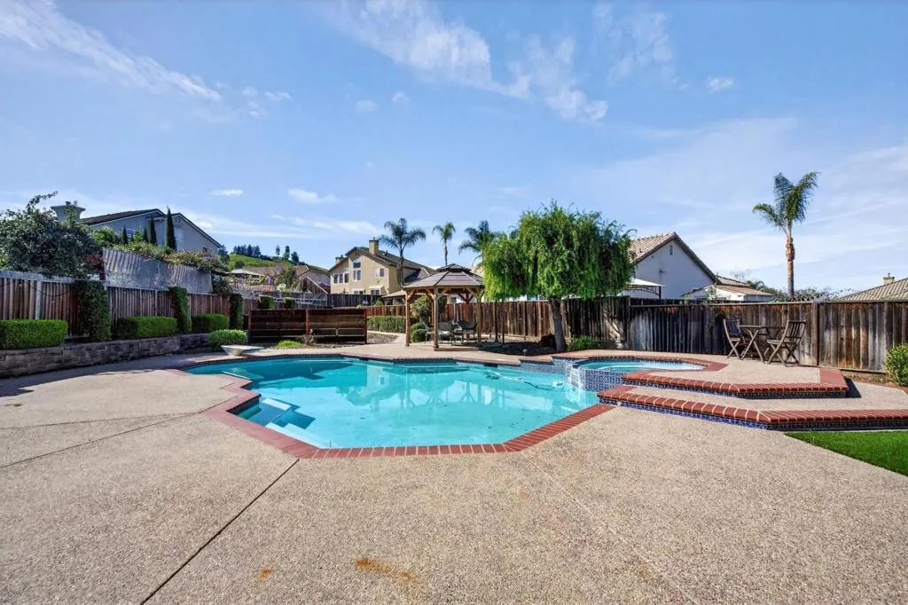 Discover unparalleled comfort in this spacious 3,250 sq ft residence, ideally situated on a tranquil cul-de-sac. This property boasts a generous 13,000+ sq ft lot, offering privacy and ample outdoor living space. The welcoming entry leads to an open-concept living area, seamlessly connecting to a modern kitchen, a separate family room, and a versatile formal dining/living space. Five bedrooms provide abundant accommodation, including a convenient downstairs guest suite with a full private bath, plus an additional guest half-bath on the main level. The tastefully updated master suite is a true sanctuary, featuring ample space for a king-size bed, a cozy fireplace, a large walk-in closet, dual sinks, and a separate tub and shower. Outside, a refreshing pool awaits, complemented by multiple seating areas and expansive yard space perfect for entertaining. An oversized driveway ensures ample parking for guests. This home is an entertainer's dream and a perfect family retreat.