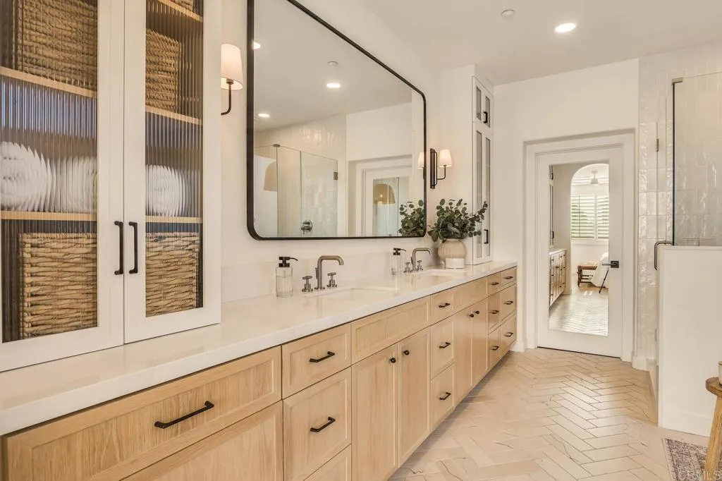 Located in Encinitas Ranch, just minutes from the coast, golf, and neighborhood trails, this home balances thoughtful design with everyday livability. The backyard is designed for year-round use, with a built-in fireplace, overhead heaters, and spa creating a comfortable setting for evenings at home. The family room flows naturally from the kitchen, anchored by a fireplace with custom built-ins that balance texture and simplicity. Expansive windows draw in natural light while a glass door opens to the backyard creating an easy indoor-outdoor connection. The result is a space that feels open, welcoming, and perfectly suited for gathering with family or hosting friends. At the heart of the kitchen, a statement Wolf six-burner range is framed by artisan tile and a custom wood hood, while the built-in Sub-Zero refrigerator integrates beautifully into the surrounding cabinetry. Quartz countertops extend across a generous island with seating, offering ample space for meal prep, casual dining, or conversation. The primary suite is designed as a private retreat, offering generous scale, layered ceiling detail, and abundant natural light. The space feels open, airy, and quietly refined, with a seamless flow into the spa-like primary bath featuring an expansive dual-sink vanity with extensive storage, a separate soaking tub, and a walk-in shower. Completing the home are three additional bedrooms, each with its own ensuite bathroom, including an entry level bedroom and full bathroom. A Tesla Powerwall in the garage adds a practical layer of energy efficiency. Call to schedule a private showing.