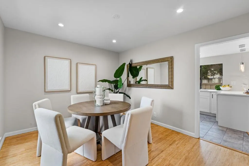 Set on a desirable corner in Foster City, this inviting townhouse offers comfortable living with a touch of everyday elegance. Warm refinished bamboo floors span the main level, and the front door opens to a sun filled living room that feels welcoming from the start. With over 1900 square feet, the home provides space to settle in without feeling overwhelming. The home offers a true dining room for gatherings, plus a separate family room with fireplace adjacent to the updated kitchen, creating natural spaces to relax, cook, and spend time together. Upstairs features a spacious primary bedroom with dual closets and a walk-in shower, along with three additional bedrooms and a large hall bathroom. 4 bedrooms and 2.5 baths provide flexibility for guests, office space, or changing needs over time. The rear yard includes a large stamped concrete patio, ideal for outdoor seating and everyday enjoyment. Central air conditioning keeps the home comfortable year-round. Close to parks, waterfront paths, shopping, and commute routes, this is Foster City living that is easy, comfortable, and simply makes sense.