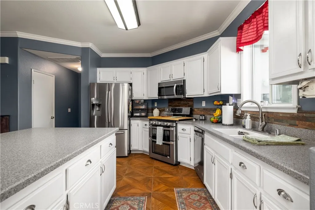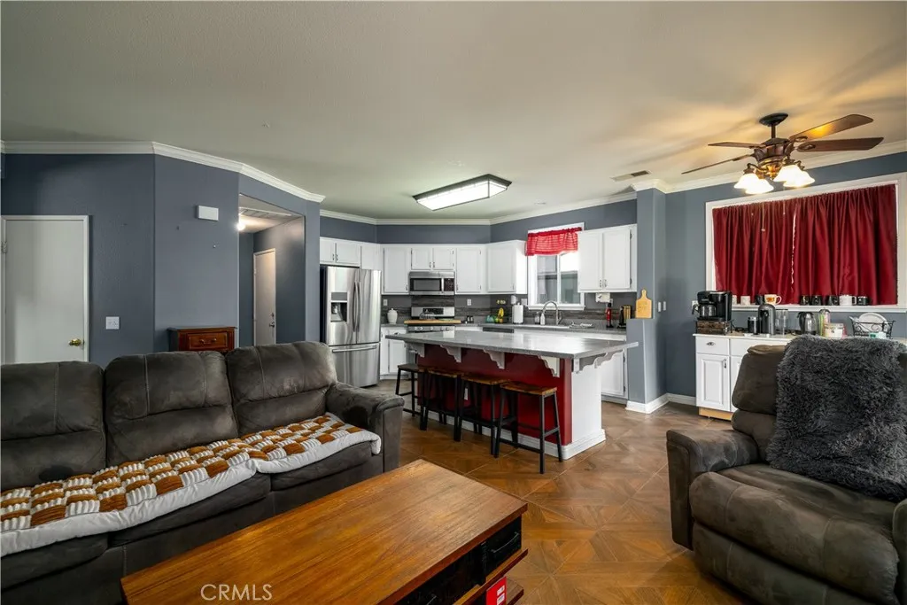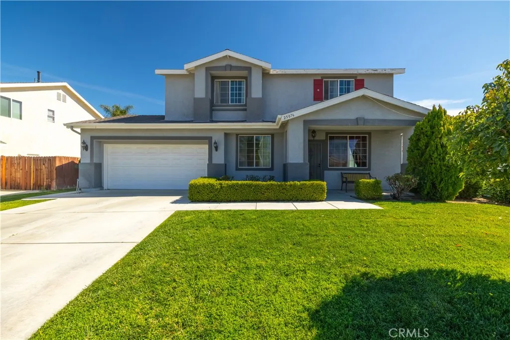 If you’ve been searching for a home with room for everyone, this spacious East Hemet property offers a floor plan that’s hard to find. With a true downstairs bedroom, a large downstairs office that could easily serve as a fifth bedroom, and multiple living areas throughout, this home provides the flexibility today’s buyers are looking for, whether for multi-generational living, working from home, or simply having space to spread out. Step inside to a bright living and dining room combination with laminate wood flooring and an upgraded dining light fixture. The layout then flows into the kitchen & family room, creating a comfortable gathering space for everyday living or entertaining. The kitchen features an extended island, Corian countertops with integrated sink, stainless steel appliances (refrigerator included), a pantry, & durable wood-look tile flooring, along with crown molding and upgraded baseboards. Just off the kitchen, the family room showcases a fireplace with custom mantle and shelving, creating a warm and inviting place to relax. One of the standout features of the home is the highly desirable main-level layout. In addition to the downstairs bedroom with an oversized under-stair closet providing exceptional storage, there is also a spacious office or bonus room with closet that could easily serve as a fifth bedroom. The nearby half bathroom is already plumbed for a possible stand-up shower by utilizing the adjacent linen closet space. Upstairs, a versatile loft offers additional living space perfect for a media room, play area, or second family room. The dedicated upstairs laundry room includes shelving, with washer and dryer included. The primary suite is generously sized and features crown molding, dual walk-in closets, and an en-suite bathroom with dual sinks, a sit-down vanity area, soaking tub, & separate shower. Two additional bedrooms and a full bathroom complete the upper level. The backyard is designed for relaxing or entertaining, featuring a solid wood patio cover with ceiling fans and mounted TV (included), an expansive concrete patio, grassy yard, and storage shed. With plenty of open space, there is also room to add a future pool or create your own outdoor retreat. Spacious layout and flexible living areas offer buyers the opportunity to personalize finishes over time while enjoying a floor plan designed for everyday living. Located in East Hemet with no HOA, low taxes, close to parks, schools, & shopping.