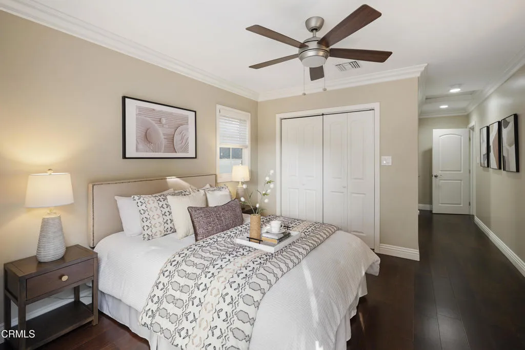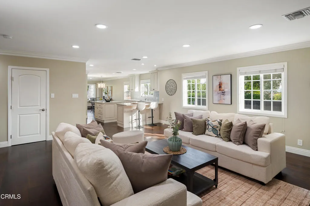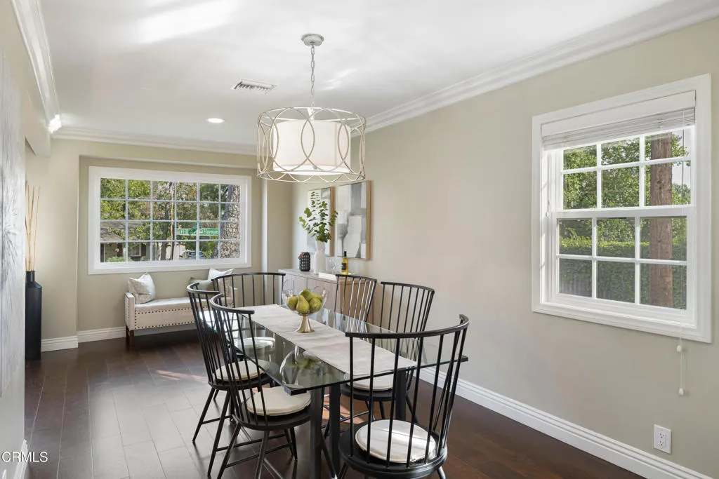 Ideally located in the sought-after foothills of La Canada Flintridge, this charming corner-lot home combines timeless appeal with thoughtful updates. Impeccable curb appeal welcomes you with manicured landscaping, a mature shade tree complete with a classic rope swing & a winding flagstone pathway leading to the covered front porch. Inside, hardwood flooring & crown molding set a warm tone in the light-filled living room. A corner gas fireplace with an oversized mantel anchors the space, while recessed lighting & a large picture window overlook the lush front yard. The open layout flows into the dining room, highlighted by another expansive window & a stylish designer chandelier, perfect for gatherings both intimate & grand. The remodeled kitchen is a true centerpiece, featuring stone countertops, a custom-tiled backsplash, recessed lighting, crown molding & a premium stainless Viking Professional appliance suite, including a six-burner range & oven, range hood, refrigerator, freezer & dishwasher. The kitchen opens seamlessly to a spacious family room with recessed lighting & crown molding, creating an ideal setting for everyday living & entertaining. Direct access to the attached two-car garage & additional storage enhances convenience. The bedroom wing offers comfort & privacy. Two secondary bedrooms feature hardwood floors, crown molding, dual-pane windows & mirrored closet doors. A full hallway bathroom includes a deep soaking tub & shower combination, an oversized stone-topped vanity & elegant finishes. A whole-house fan provides added efficiency. A dedicated laundry area with a side-by-side washer & dryer is tucked behind louvered doors. A versatile third bedroom, currently used as an office, offers generous closet space & a sliding door leading to the backyard. At the rear of the home, the primary suite serves as a serene retreat with crown molding, a ceiling fan & French doors opening to the patio. The ensuite bath is beautifully updated with basket-weave tile flooring, a dual-sink stone vanity, recessed lighting & a custom glass-enclosed shower with bench seating & tile extending to the ceiling. Outdoors, the backyard is designed for both relaxation & entertaining, featuring a pergola-covered patio with a built-in barbecue island, a grassy yard & raised garden beds. Located in a wonderful neighborhood close to excellent schools, local dining, & shopping, this La Canada home offers comfort, quality, and lifestyle in one exceptional setting.