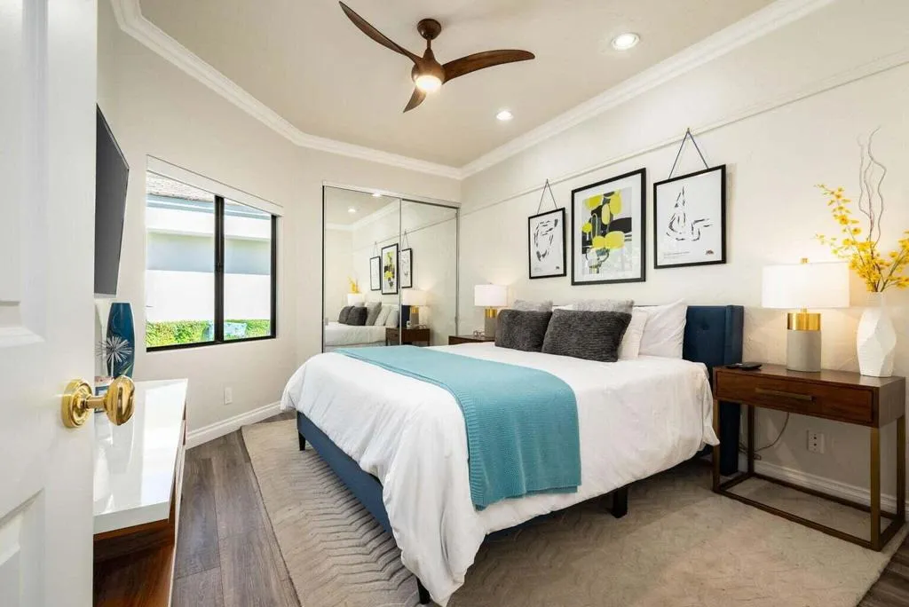 Walls of glass frame panoramic southern views of lake, fairway, and Santa Rosa mountains from the moment you enter this PGA West residence, set on the iconic Par 3 13th hole of the Pete Dye Stadium Course - home of the American Express PGA Tournament.This sought-after Champion 2 floor plan offers soaring ceilings, true indoor-outdoor flow, and a compelling alignment of golf, water, and mountain views. The residence features two bedrooms plus a versatile den and a thoughtfully designed kitchen with stone counters, stainless appliances including a newer refrigerator, and a clean, Scandinavian-inspired aesthetic that carries throughout the home. Well-appointed baths with walk-in showers and refined finishes complement the cohesive design, while a newer air-conditioning system adds everyday comfort and efficiency.A private courtyard and golf-view patio extend the living space, creating effortless indoor-outdoor living. A two-car garage with EV charging station adds modern convenience. Ideally located near community pools, spas, and clubhouse amenities, with access to championship golf, tennis, pickleball, dining, and 24-hour guard-gated security.Offered turnkey furnished for immediate enjoyment in one of PGA West's most visually striking settings.