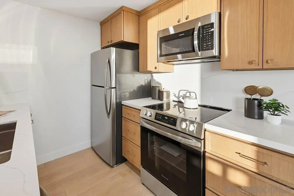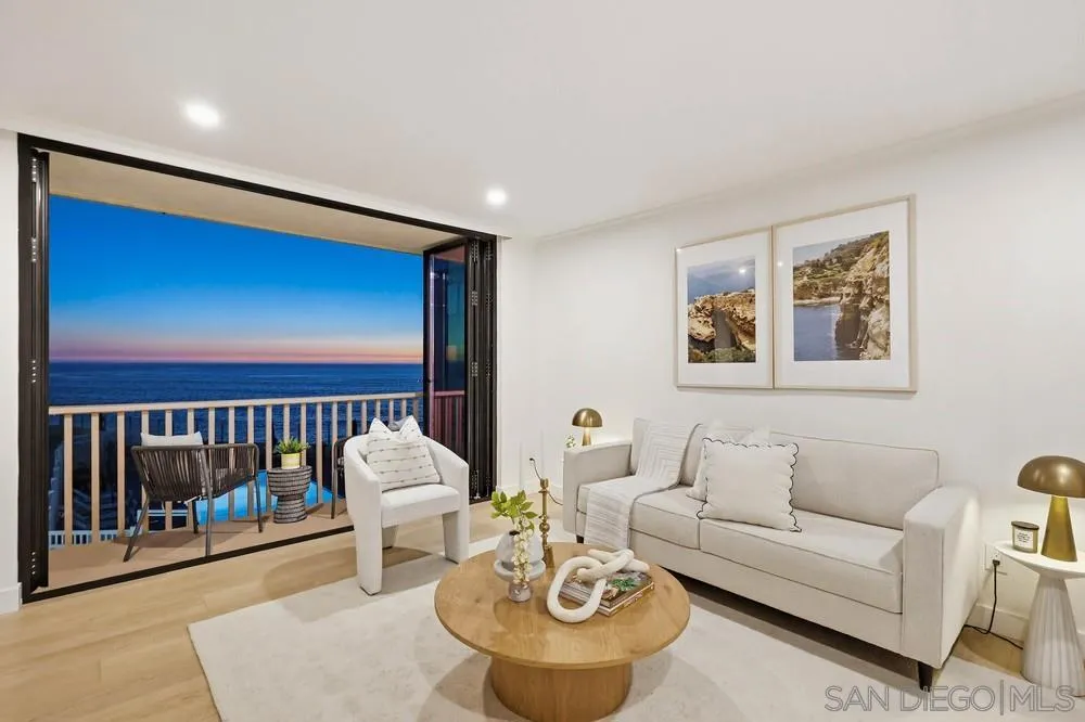 OCEANFRONT!! This amazing unit has forever panoramic ocean and coastal views from most every room! Live the dream of having the beach at your door! Hear the ocean every morning as you wake up and watch the sunsets every evening. Vacation 365 days a year! This home is in great condition with white oak cabinets, quartz counters, designer finishes, laminate wood flooring, a cozy electric fireplace, and bifold doors to immerse you in the incredible views! Spacious, light, and bright 1 bedroom. Single-level unit with an amazing balcony overlooks the pool, BBQ and Ocean. Smell the ocean and feel the breeze! This is a rare find in South Ocean Beach! Amenities include an elevator, pool, BBQ area, community garden, two guest suites that are available for residents at the amazing price. Two coved beaches are just below you, and yes, it does have guest parking also!!!