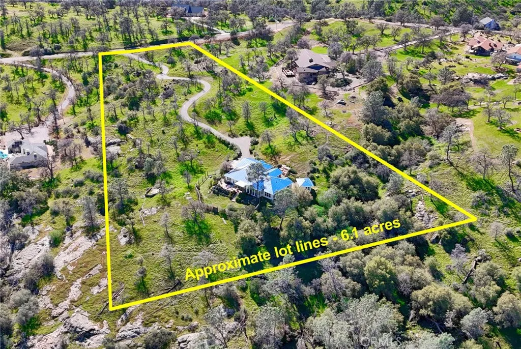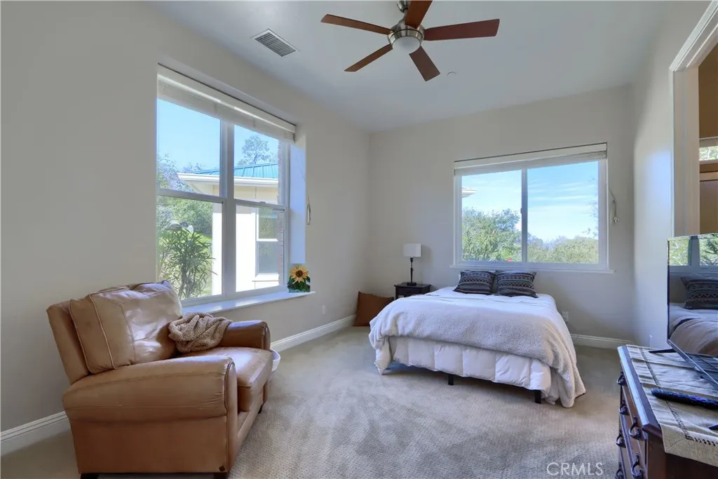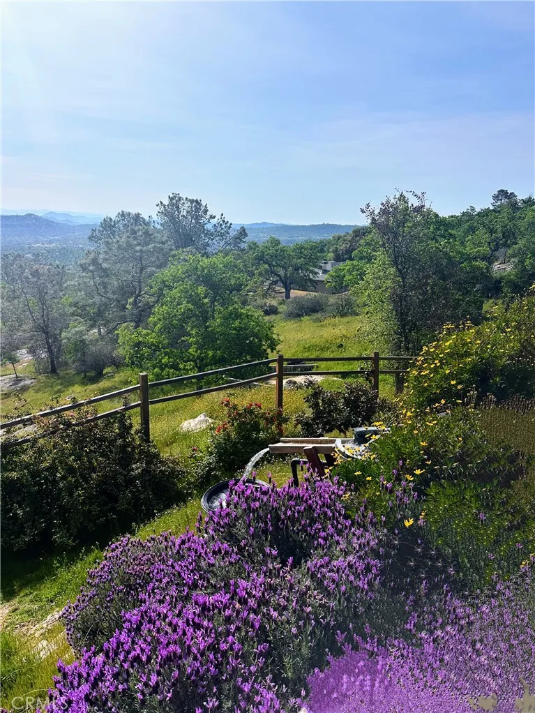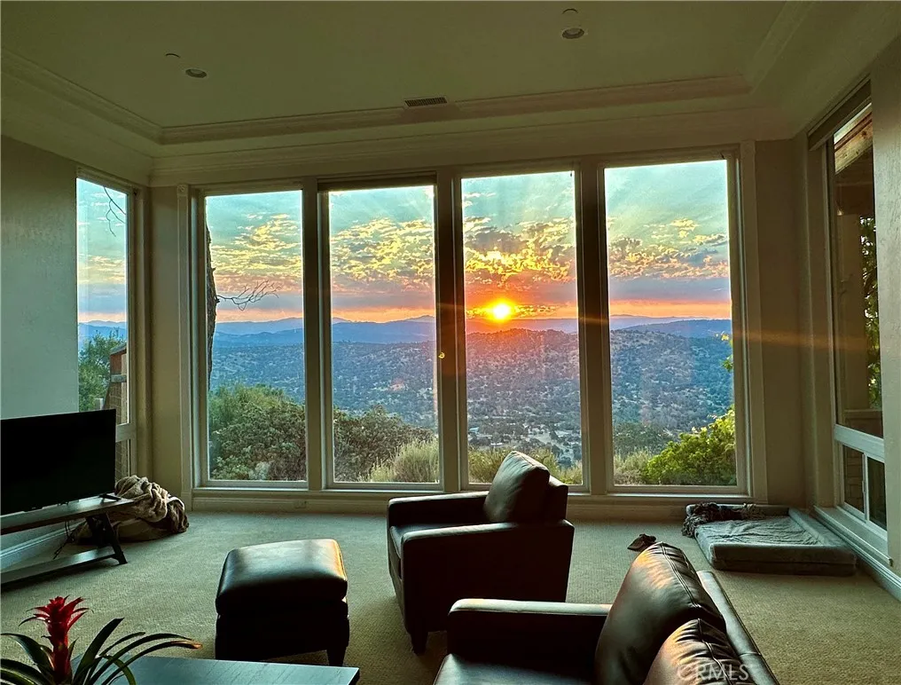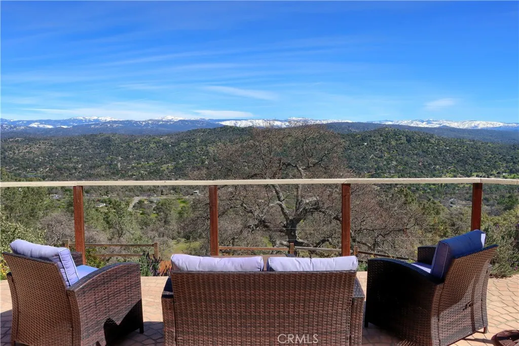Single-story custom home on over 5 private acres offering panoramic, unobstructed 180-degree mountain and sunrise views. Built in 2015, this 3,986 sq ft residence features 5 bedrooms and 4 bathrooms, including a separate furnished guest house with bath (included in count), along with two large, dedicated office spaces ideal for remote work or multi-generational living. The home is filled with expansive windows in every room, bringing in abundant natural light and capturing scenic views throughout. The main living area showcases dramatic 16-foot floorto-ceiling windows framing the surrounding landscape and an impressive gas fireplace. Spacious eat-in kitchen includes granite countertops, abundant cabinetry, and a large walk-in pantry. The primary suite offers a spa-like en suite bath with steam shower, soaking tub, dual vanities, and a generous walk-in closet. A second primary suite includes its own en suite bath and walkin closet. Neutral finishes throughout make the home move-in ready. A gently winding private driveway approximately one-tenth of a mile from the main road leads to the home, enhancing privacy and creating a quiet, secluded setting. Notable features include metal roof, fire-resistant siding, fire sprinklers, fire-rated windows, and owned solar. Additional amenities include a private gated entry, three-car garage with separate workshop waterfall fountain at the entry, and low-maintenance natural landscaping with drip irrigation. Property is ideally situated above the fog and below the snow, offering privacy, scenic beauty, and comfortable year-round living.