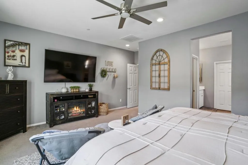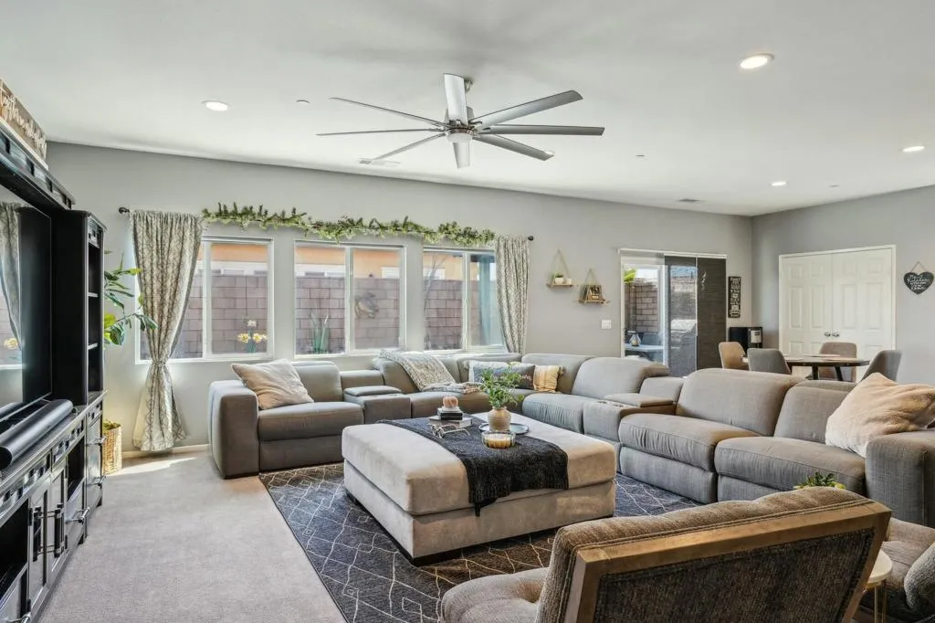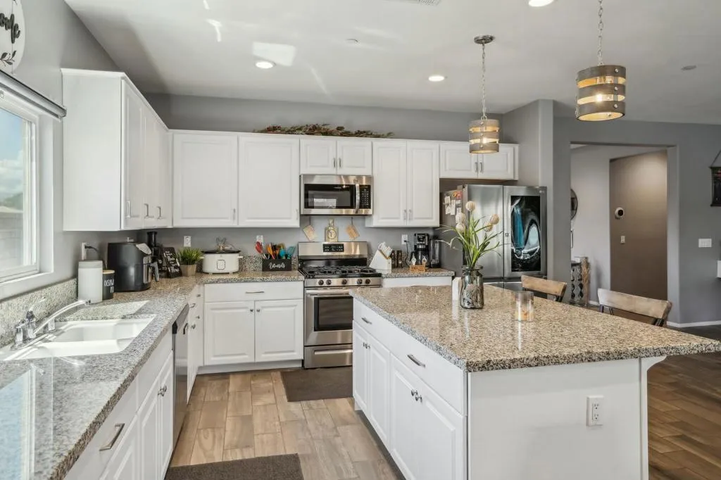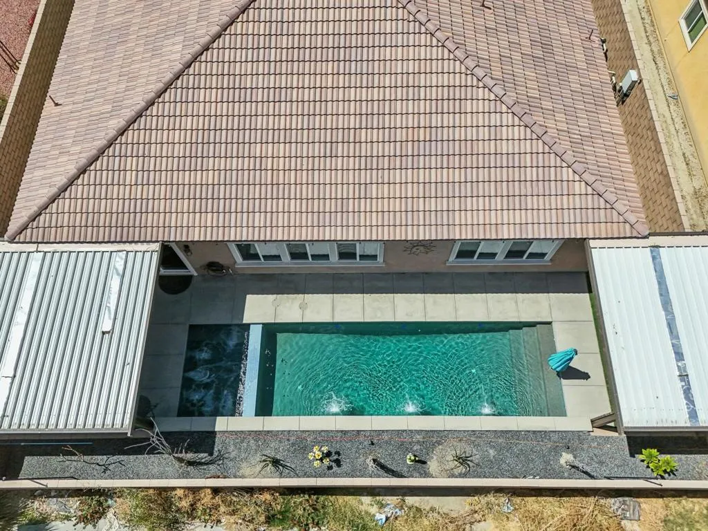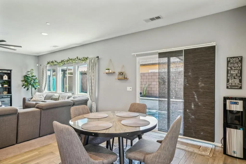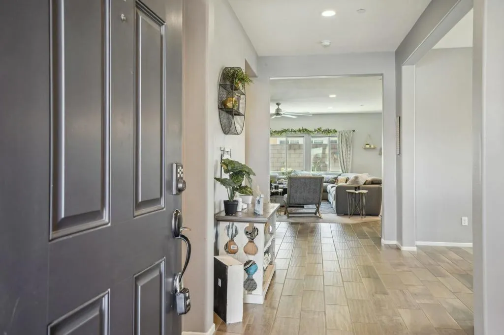 Welcome to your dream home in the Hacienda gated community! This stunning 4-bedroom, 3-bath pool home features an open-concept living room. The kitchen is a chef's delight, featuring a large prep island with exquisite granite countertops, perfect for entertaining guests or enjoying casual family meals. The flexibility of a spacious flex room, ideal for a formal dining area or versatile space.Experience luxury underfoot with the porcelain plank tile providing both durability and a touch of sophistication. The four bedrooms offer ample space for relaxation and privacy, making it an ideal retreat for every member of the familyGet ready for a backyard oasis that will take your breath away. A newly built saltwater, pebble-tec pool and spa beckon you to unwind and enjoy the ultimate in leisure. The pool features three shear waterfalls and top-of-the-line Jandy pool equipment. Experience the convenience of controlling the pool equipment and lighting remotely with a phone app, ensuring your backyard paradise is always at your fingertips. The outdoor living space is designed for year-round enjoyment, featuring 2 covered patio equipped with ceiling fans and canned lighting. Artificial turf accents add a touch of greenery without the maintenance, while a gas fire pit sets the stage for cozy evenings.