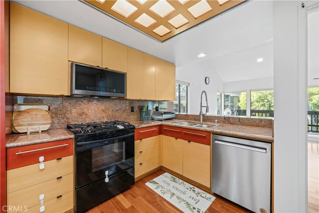 BEAUTIFUL FULLY FURNISHED HOME WITH LONG DRIVEWAY ON CUL-DE-SAC WITH PANORAMIC VIEWS OF LARGE GREENBELT THAT LEADS TO GOLF COURSE! Open floor plan with smooth cathedral ceilings, recessed lighting, and bright with natural light from many large windows. Entry level includes a great room that has an upgraded kitchen, living room with flat screen TV, den, dining room, and powder room. Flooring is wood upstairs, vinyl plank downstairs, and tile in bathrooms. Next to kitchen is an inside laundry room with washer and dryer, and a door to a 1-car carport. Gated front courtyard has a door with direct access to 1-car garage that includes storage shelves. Sliding glass door from dining room opens to outdoor deck where you can sit, relax, and take in the expansive views of the greenery. Remodeled kitchen is open to dining room and has granite counters, stainless-steel kitchen appliances, and cabinets and drawers fully stocked with pots and pans, glasses, plates, utensils and everything you need. Built-in cabinets line both sides of the staircase, and at base of stairs is door to back patio and on either side two bedrooms with private ensuite bathrooms. Large Primary bedroom has walk-in closet, vanity area and privacy door to walk-in shower and toilet, and a slider to back patio. The second bedroom has built-in shelves and cabinets and privacy door to bathroom with shower in tub. A rare opportunity with views of greenery and nature all around! House in acclaimed Irvine School District, including University High. Two community pools and spas. Conveniently located near UCI, William Mason Park, John Wayne Airport, Newport Beach, Fashion Island and walking distance to shops and entertainment. Water, trash, and exterior maintenance included.