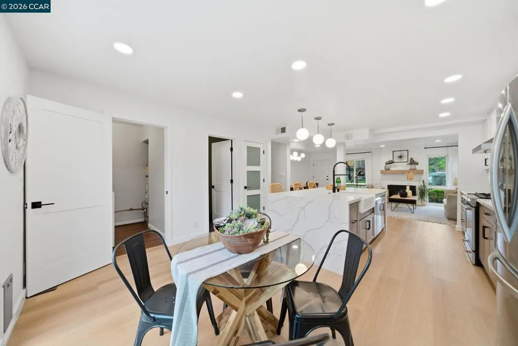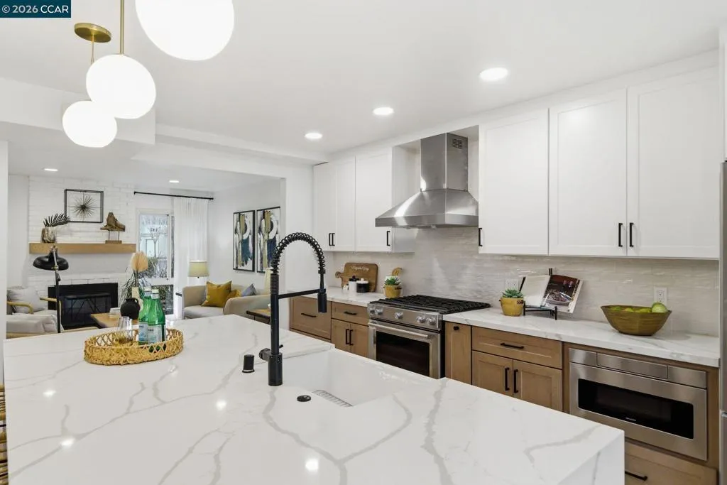Boldly reimagined with meticulous intention and elevated design, this beautifully updated home blends style and functionality throughout. The stunning kitchen was thoughtfully redesigned for flow, showcasing a KitchenAid gas range, updated appliances, custom floating wood bar shelves with integrated LED lighting, and a dramatic waterfall island. Wide-plank luxury vinyl flooring and a glass-paneled pantry door complete the modern aesthetic. Upstairs, the primary bath was expanded to include a double vanity, Kohler rain shower system, Toto bidet toilet, and striking tilework, complemented by a custom walk-in closet with integrated lighting. Roman clay walls in the primary and half bath introduce warmth and texture, paired with designer lighting and refined finishes. Step outside to a private backyard retreat designed for both relaxation and entertaining. Custom tile work, built-in planters, and installed string lighting create an inviting setting to host friends or unwind in the evening. A 2-car garage and access to Casitas community amenities complete the home. Ideally located near parks, shopping, walking and biking paths, the SF Ferry, Oakland Airport, and Alameda’s highly regarded public schools.