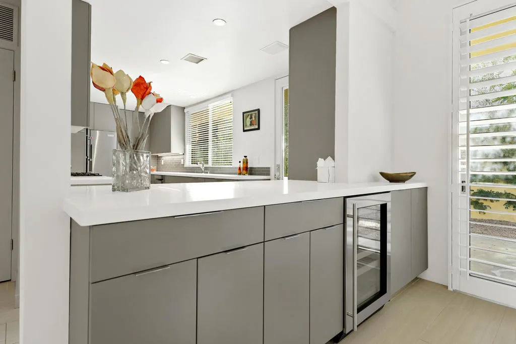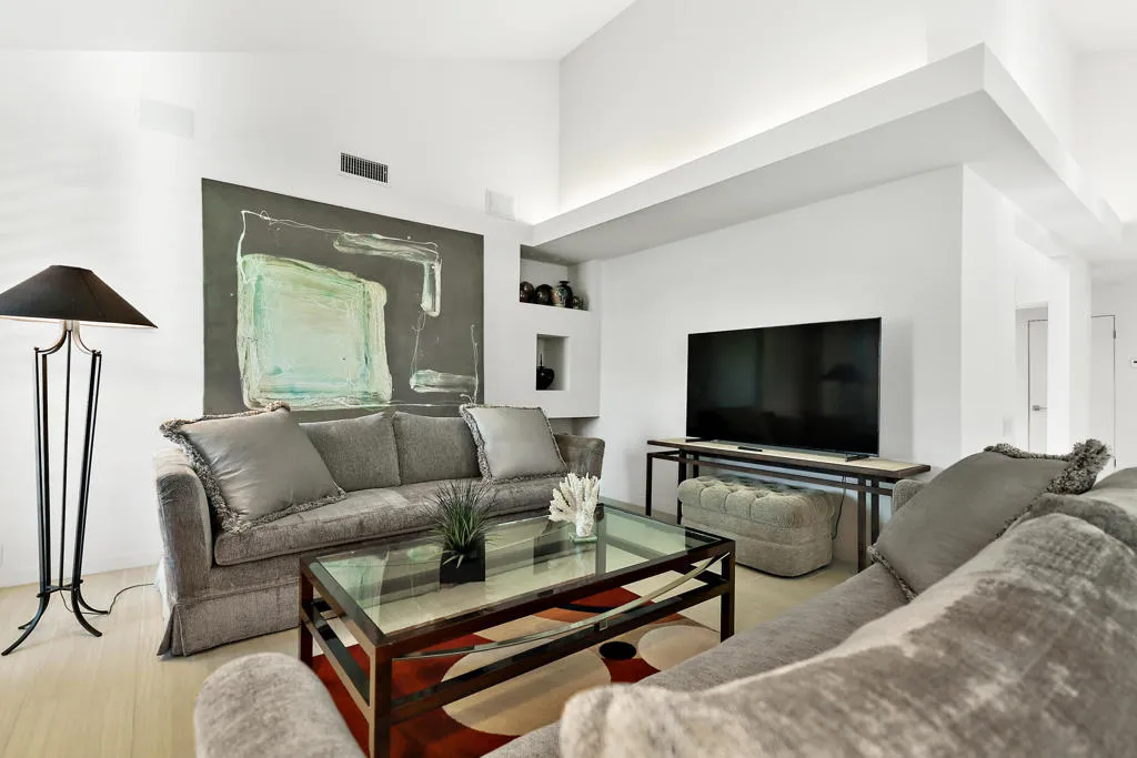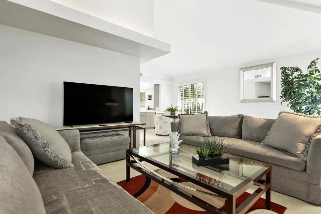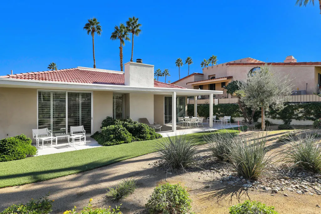 Famed architect Harold Levitt left LA to design these 5 one of a kind homes - 'The Fivesome'. The entry is awe inspiring - from the Baby Grand Piano to the elevated cross beams under the giant entry skylight to the perfectly placed windows and sliders that maximize the views and natural light. This is an incredible space for quiet enjoyment and entertaining. Fully furnished and situated on the fifth and sixth fairways of the Historic Shadow Mountain Golf Course. El Paseo close - with all the shops, restaurants and activities, right at your fingertips. A superb location! This four year old renovation includes quality dual pane windows and sliders, custom cabinets, porcelain tile floors - and even a heated primary bathroom floor. The primary also includes an office area and a large walk in closet - with Solatude skylights and built-ins. The kitchen has quartz counters with a Bosch gas range, refrigerator and dishwasher. The breakfast bar has views out to the mountains. THE DEN (original 3rd bedroom) has a large bedroom closet and is currently being used as TV room.This out of town owner hates to give this upbut duties require him to be elsewhere. Don't miss out on this one. Open noon to 4 pm Sat and Sun.
