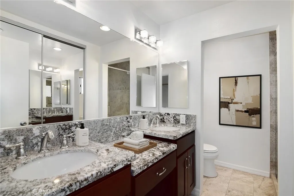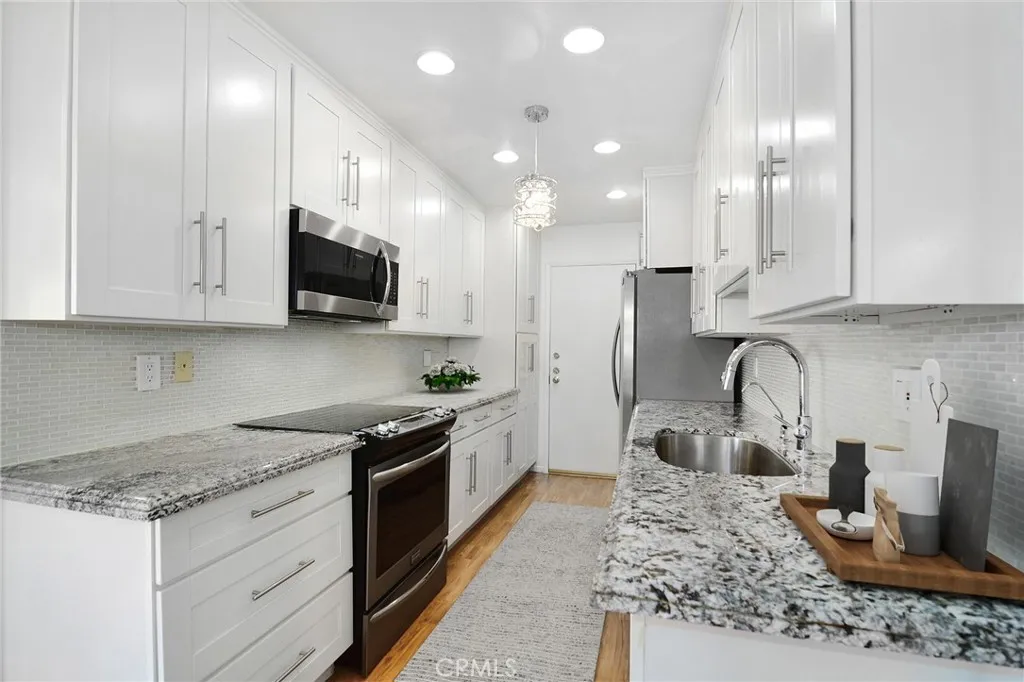Beautifully renovated Encino condominium—move-in ready and waiting for you. This prime, front-facing corner unit with only one shared wall offers serene views of lush greenery—not your neighbor’s living room. Smooth ceilings, recessed lighting, and attractive flooring create a warm, welcoming entry. The stunning kitchen features a convenient service entrance, custom cabinetry, distinctive granite countertops, quality stainless-steel appliances (including refrigerator), and an exquisite tile backsplash. A large private balcony invites you to read, relax, or dine surrounded by nature. The primary bedroom is a true retreat, filled with natural light from a large window that frames tranquil exterior views. Mirrored wardrobes plus a walk-in closet provide excellent storage, while the beautifully remodeled en-suite bath boasts a striking walk-in shower. A spacious secondary bedroom and tastefully upgraded second bath complete the interior. At the heart of this well-maintained community, enjoy a refreshing pool and soothing spa. Includes two convenient parking spaces. All this and just a short stroll to Ventura Boulevard. Don’t miss this exceptional opportunity.