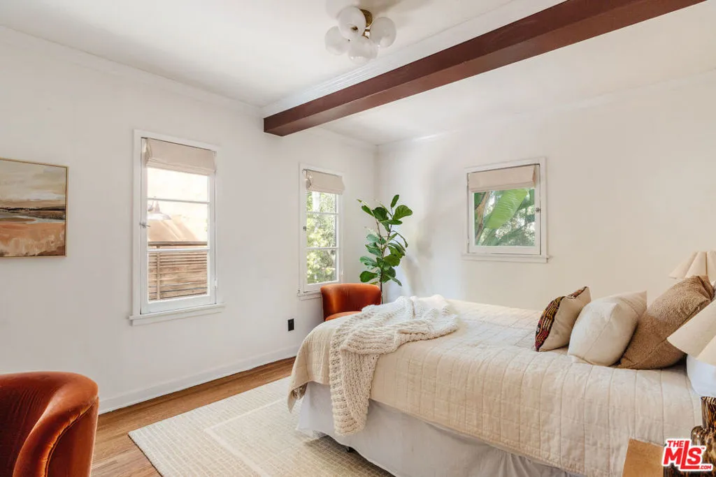 Built in 1927 and rich with character, this Spanish Revival residence sits tucked behind a patterned iron gate and newly planted hedges, unfolding with quiet confidence and architectural presence. Classic stucco walls, red clay rooflines, carved wood detailing, and a tiled arch brushed with bougainvillea set the tone before you even step inside. A private courtyard greets you first, establishing a sense of retreat and intimacy that feels distinctly Californian. Through the arched wood door, the living room rises dramatically with vaulted ceilings and dark-stained beams, each one anchored by carved corbels that add depth without excess. Original red oak hardwood floors run underfoot, carrying the warmth of the era throughout the home. The fireplace serves as the architectural anchor of the room, finished with its original tile hearth and mantle, a detail that quietly preserves the home's craftsmanship and history. Divided-light windows frame greenery on all sides, allowing natural light to move through the space. Built-in arched niches, linen drapery, and thoughtfully placed sconces add rhythm and softness. A subtle step-up introduces dimension while maintaining flow, a quiet nod to classic Spanish planning. Arched transitions guide you from space to space, creating a natural cadence throughout the home. In the dining room, a warm amber-glass chandelier casts a soft glow, echoing the richness of the original floors and setting an inviting stage for gatherings.The kitchen respects the architecture while feeling fresh and refined. Crisp white cabinetry meets honed stone countertops and warm brass hardware. A farmhouse sink with a statement faucet anchors the room, while patterned tile behind the range introduces artistry without overwhelming the design. Stainless appliances and open shelving are integrated with restraint, allowing the character of the home to remain at the forefront. The primary suite is generous yet serene, designed with clean lines and a restrained palette. A skylight draws in natural light from above, while a new French door opens directly to the courtyard, reinforcing the home's connection to air and landscape. The bath has been reimagined with dual vanities, custom cabinetry, and wall-mounted fixtures set against large-format stone tile. A second skylight brightens the room, highlighting subtle veining and creating a calm, restorative atmosphere. A well-organized walk-in closet completes the suite with ease and function. Throughout the home, walls have been refinished and painted, lighting elevated with curated fixtures, and hardware selections carefully considered for cohesion. The courtyard has been refreshed with new lighting and finishes, creating an intimate setting for evening dinners or slow mornings. A driveway extends to the rear with EV charging, adding modern practicality to the property's architectural integrity. Ideally positioned in the heart of Beverly Grove, moments from the iconic Beverly Center and the boutiques of Melrose Place, this location places you at the center of one of LA's most vibrant lifestyle corridors. Enjoy coffee at Alfred Coffee or Verve Coffee Roasters, weekend brunch at Joan's on Third, dinner at A.O.C. or Bacari W 3rd, and shopping at The Grove just minutes away. Everyday essentials are equally convenient with Whole Foods Market, Erewhon,Trader Joe's, and neighborhood favorites lining West 3rd Street. Offers due Wednesday, March 11th at 5pm.