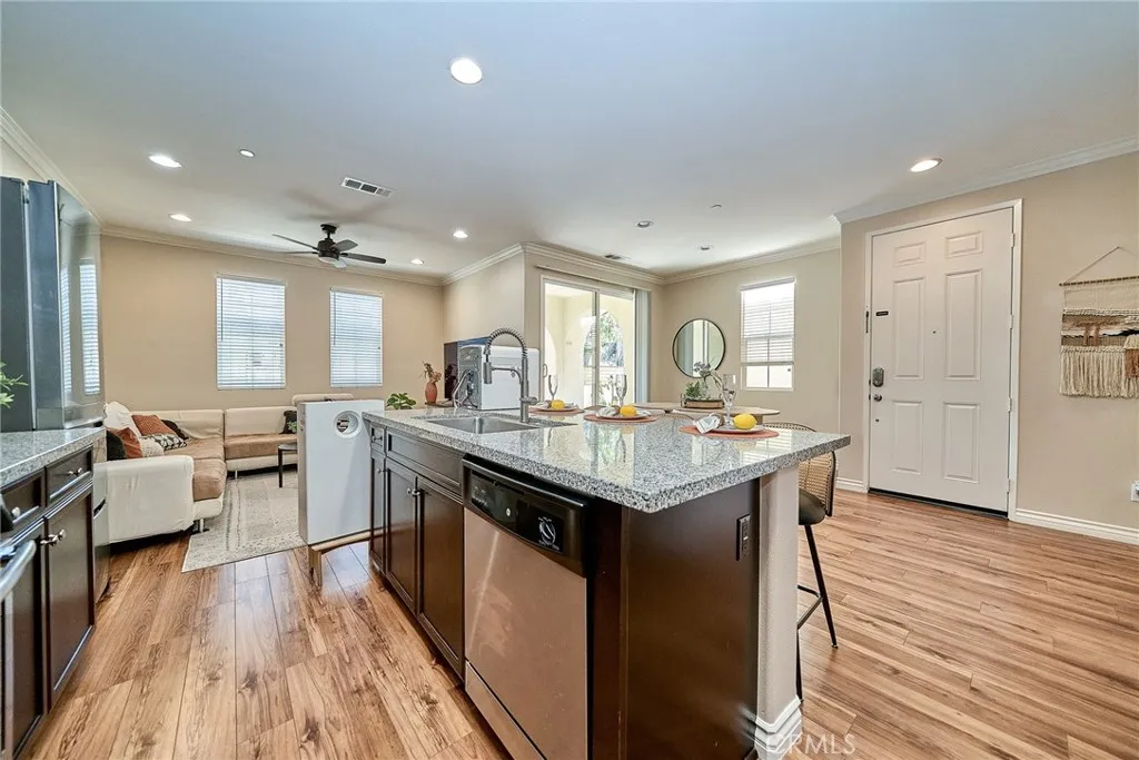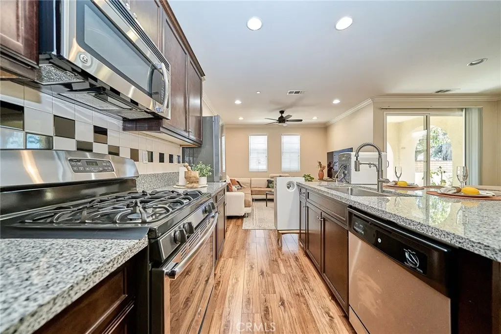 Welcome to this beautiful End Unit townhome, ideally situated on a premium corner lot in Elevage, one of the most desirable gated communities in Rancho Cucamonga. This beautifully appointed residence offers the perfect blend of style, comfort, and convenience. Residents of Elevage enjoy resort style amenities, including a sparkling pool and spa framed by swaying palm trees, as well as built-in BBQ areas that create a true everyday vacation atmosphere. Step inside to a stunning great room showcasing an open concept design, high ceilings, abundant natural light, and elegant laminate flooring throughout. The gourmet kitchen is thoughtfully appointed with granite countertops, an expansive center island, stainless steel sink, rich dark wood cabinetry, stainless steel appliances, and recessed lighting that enhances both form and function. The kitchen flows seamlessly into the dining area and spacious family room, where a large sliding glass door opens to your private patio, perfect for entertaining guests or enjoying peaceful evenings outdoors. Upstairs, you’ll find a versatile loft ideal for a home office or media space, a convenient laundry room with ample storage, a beautifully upgraded full bathroom, and two generously sized secondary bedrooms. The luxurious primary suite is privately tucked down the hall and features its own balcony retreat. Bathrooms throughout the home showcase tasteful upgrades and modern finishes. Additional highlights include direct access to a two-car attached garage and an energy-efficient tankless water heater. Ideally located just minutes from major freeways, premier shopping and dining at Victoria Gardens, outdoor recreation at Windrows Park, and within the highly acclaimed Etiwanda School District, this exceptional home offers the lifestyle you’ve been waiting for.