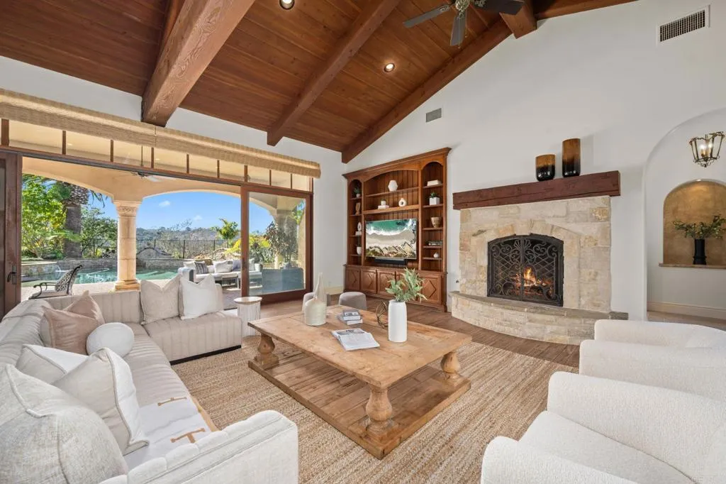 This stunning Greg Agee–built custom estate sits on an elevated lot in the guard-gated community of Rancho Pacifica, offering beautiful views, an A+ floor plan, and seamless indoor/outdoor living. The main level features a luxurious primary suite with spa-like bath, en-suite guest room, wood paneled office, climate-controlled wine cellar, home theater, gym/game room, and living/dining rooms with views of the resort-style backyard. The chef’s kitchen and great room open to a covered patio with fireplace, outdoor kitchen, and a gorgeous pool and spa, surrounded by lush landscaping, fruit trees, and a grassy area perfect for kids or pets. Interior highlights include French Traditions custom cabinetry throughout, pecan plank wood and travertine floors, and brand new laser jet theater projector, plus in-home speakers, fully paid solar, and Lutron lighting system. Residents love Rancho Pacifica’s highly sought-after West-side location, offering easy access to shopping or dining at One Paseo, top-rated schools, the beach, and major freeways—all while feeling exceptionally private and tucked away. This is luxury living at its finest in one of North County’s most prestigious communities.