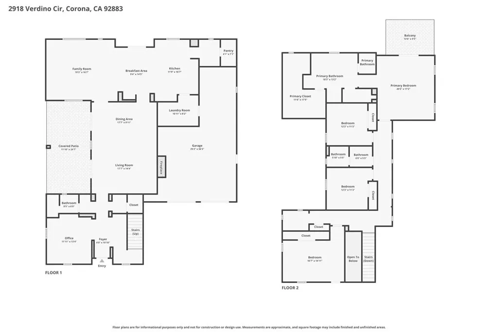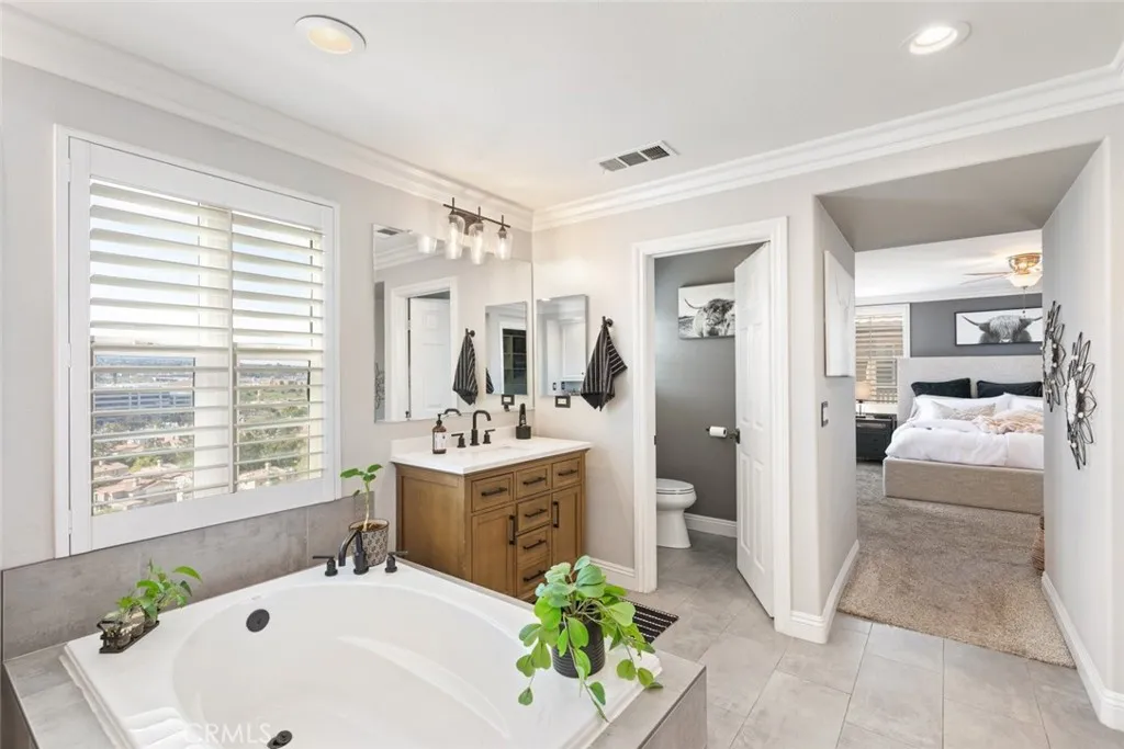 Welcome to Temescal Heights at Dos Lagos — one of Corona’s most desirable gated communities! Situated at the end of a quiet cul-de-sac, this magnificent residence offers stunning curb appeal with a spacious front yard, lush greenery, and an inviting presence that sets the tone for what awaits inside. Offering 4 bedrooms, 3 bathrooms plus a dedicated office (optional 5th bedroom), this home showcases a bright, open floor plan enhanced by beautiful travertine stone flooring. The formal living room features a cozy fireplace and flows seamlessly into the elegant formal dining room — perfect for gatherings and special occasions. The expansive family room also boasts a fireplace along with a built-in media niche for comfortable everyday living. The chef-inspired kitchen is beautifully appointed with rich dark cabinetry, gorgeous granite countertops, stainless steel appliances, a convenient butler’s pantry ideal for entertaining, and a spacious walk-in pantry for exceptional storage. An elegant wrought-iron staircase banister adds a dramatic architectural touch. Upstairs, the luxurious primary suite is truly fit for royalty, offering a spa-like bathroom complete with a soaking tub, walk-in shower, dual sinks, and a generous walk-in closet. Step out onto your private balcony and take in breathtaking panoramic views of rolling hills, mountains, and sparkling city lights — a spectacular backdrop both day and night. Additional interior features include ceiling fans, plantation shutters, and crown molding throughout. The backyard is designed for relaxation and entertaining, featuring a beautiful paver deck, alumawood patio cover with ceiling fans, maintenance-free turf, and a private hot tub where you can soak while enjoying the stunning scenery. Don’t miss this rare opportunity to own a view home in one of Corona’s most sought-after gated neighborhoods. ***SELLER CAN BUY DOWN THE INTEREST RATE FOR THE BUYER***
