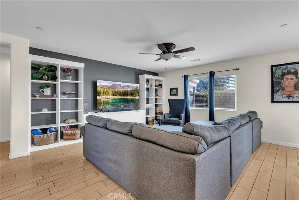 Move-in ready 4-bedroom, 2-bath home located in the Bella Vista development in Hanford. This home features durable wood-look tile flooring throughout the main living areas and an open-concept layout connecting the kitchen and living room. The kitchen offers white shaker cabinets, subway tile backsplash, stainless steel appliances, and a large island with additional seating space. The living room includes built-in white cabinetry and ample space for furnishings. The primary suite features dual sinks, a soaking tub, and a separate shower. Secondary bedrooms include carpet flooring and ceiling fans. The backyard offers a concrete patio, established lawn, storage shed, garden area, and a separate dog run. Conveniently located near Sierra Pacific High School, local shopping, and dining. Approximately a short drive to NAS Lemoore, making it a great option for those seeking proximity to the base.
