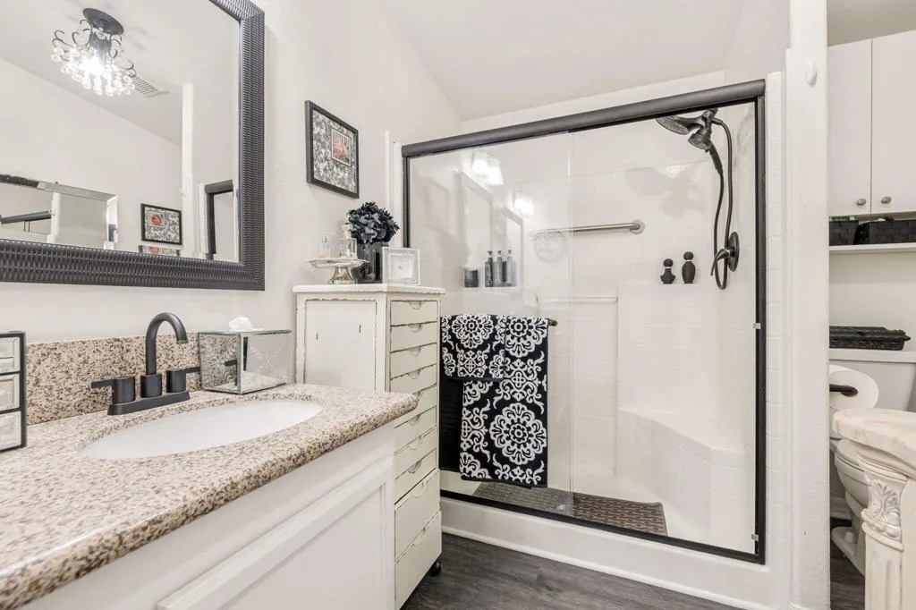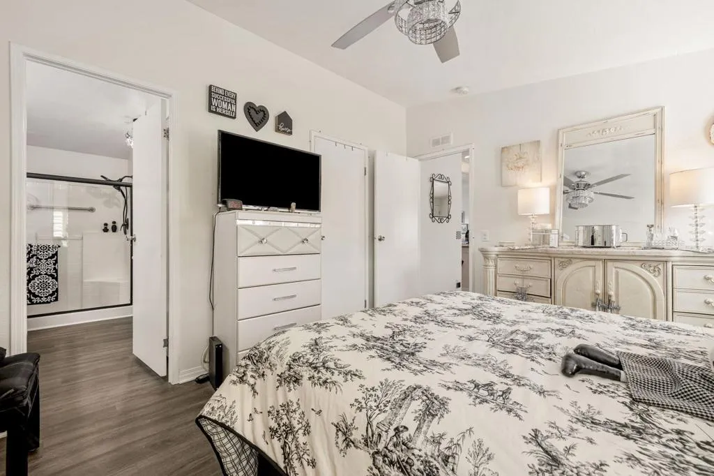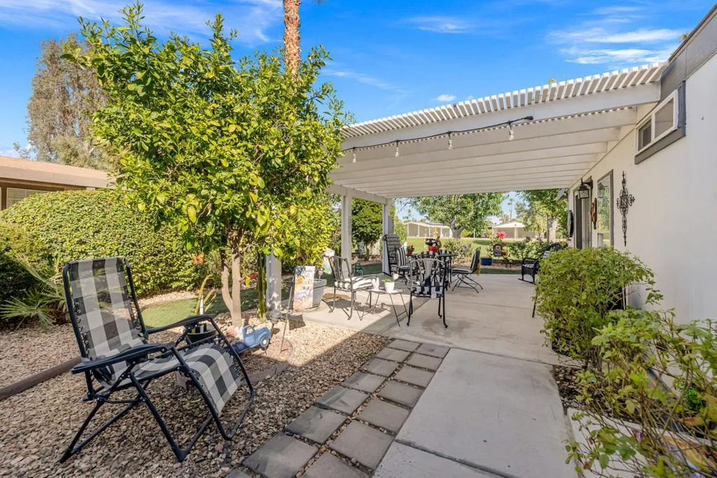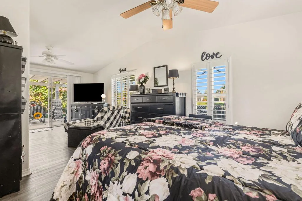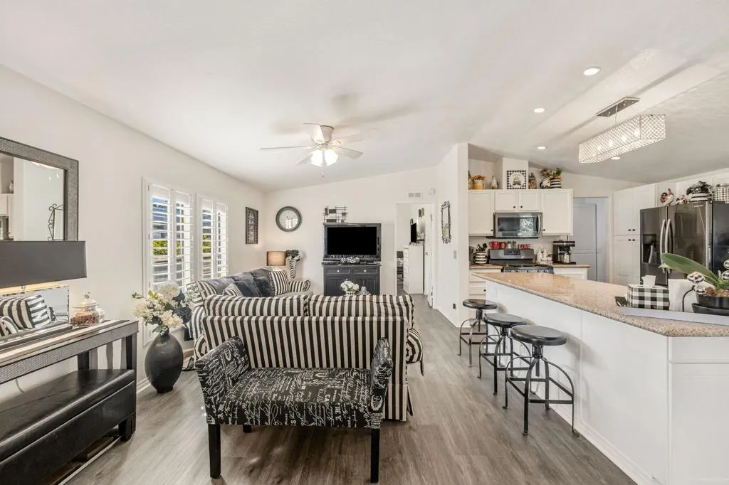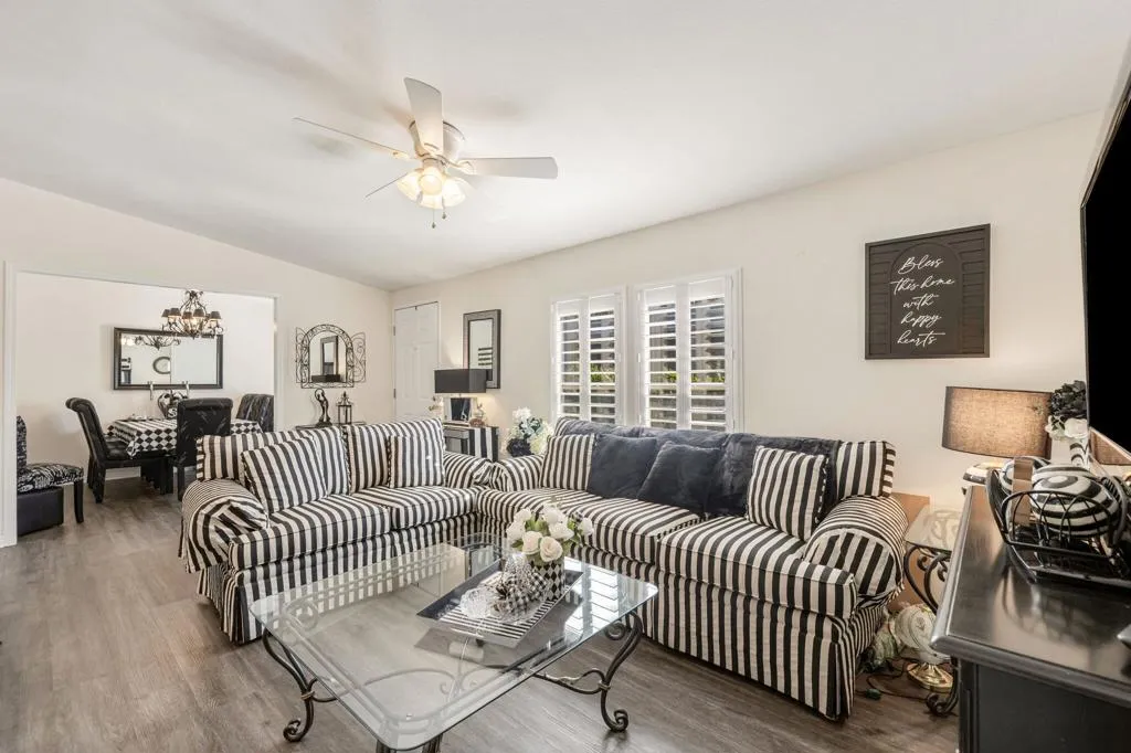 Located within the gated 55+ community of Suncrest Country Club, this beautifully maintained residence offers an exceptional setting directly on the golf course with sweeping views and a thoughtfully designed layout. An expansive backyard opens to the fairway and features two covered patio areas--ideal for outdoor dining, morning coffee, or evening gatherings. The mature garden creates a private, tranquil atmosphere rarely found in this price category. Inside, the open floorplan is filled with natural light from an abundance of windows. Luxury vinyl flooring runs throughout the home, complemented by classic interior shutters that add both style and functionality. The kitchen is designed for connection and convenience, anchored by a large L-shaped island and seamless flow into the main living areas. A separate dining room provides space for more formal entertaining. The primary suite is positioned on one end of the home for privacy, while the secondary bedroom, exceptionally spacious is located on the opposite side. Currently configured as a den with sleeping quarters, this versatile room includes direct access to the backyard, making it ideal for guests or multi-use living. Additional highlights include a dedicated laundry room and an attached side-by-side two-car garage. Residents of Suncrest Country Club enjoy resort-style amenities designed for active adult living. The community's 359 homes surround a scenic 9-hole golf course designed by Dick Watson. Amenities include a welcoming clubhouse, one tennis court, eight pickleball courts, and three pools and spas--all within a secure, gated setting. An outstanding opportunity to enjoy golf course living with generous outdoor space, functional design, and access to exceptional amenities.
