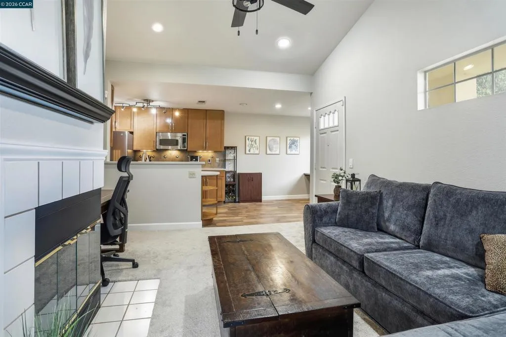Tucked quietly at the back of the community, 7020 Stagecoach Rd., #G in Dublin offers a private and inviting 722 square foot townhome retreat filled with comfort and style. Fresh new paint and plush new carpet complement vaulted ceilings and abundant natural light, creating an airy, open, and welcoming atmosphere throughout. The updated kitchen features solid surface countertops, stainless steel appliances and flows seamlessly into a dedicated dining area, while the living space is anchored by a cozy fireplace ideal for relaxing evenings. Enjoy the convenience of in unit laundry, an updated bathroom, walk-in shower and thoughtful indoor outdoor living with a spacious balcony offering extra storage. Residents enjoy access to a sparkling community pool , tennis courts, and clubhouse all located in a peaceful, well maintained setting. Ideally located near major freeways and Bay Area Rapid Transit for easy commuting, the home is also close to parks, walking trails, grocery stores, dining, and everyday amenities. Situated within the highly regarded Dublin Unified School District, the neighborhood is known for its quiet suburban feel, strong community events, and family oriented lifestyle, making this a wonderful place to call home.