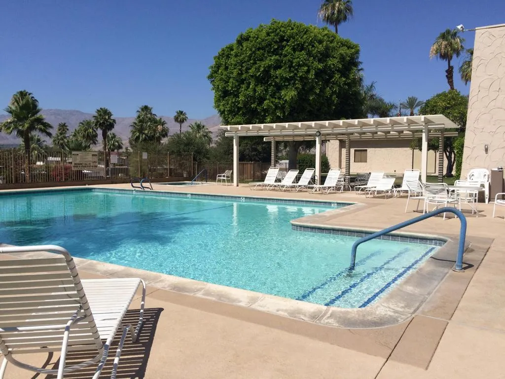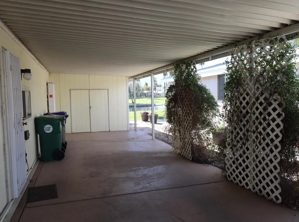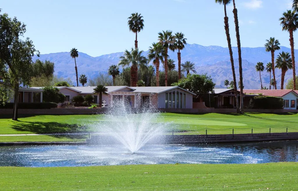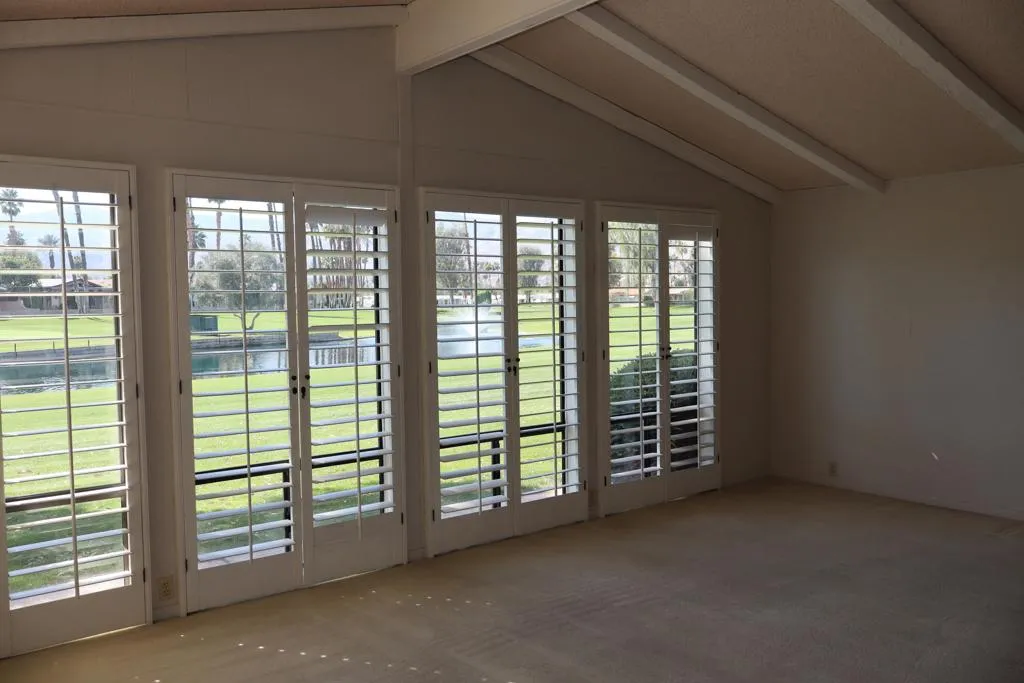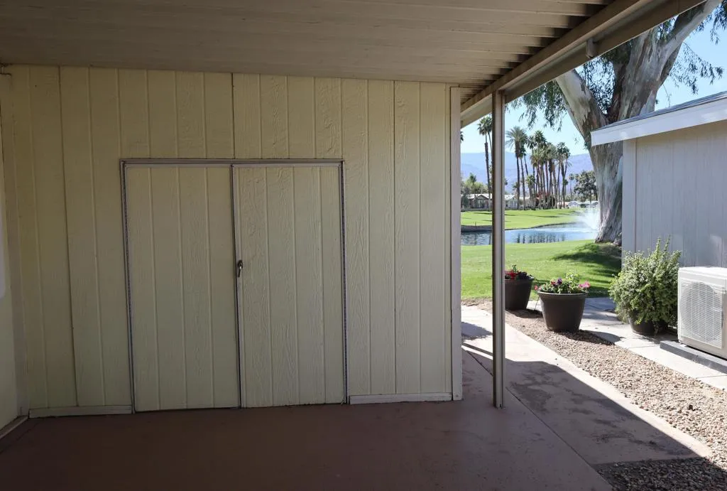 Location-Location-Location! This prime lot offers both views & privacy. Over 1800' with a new roof in 2023. Situated overlooking the Golf Course, this home is the last home on the fairway with no home next door from the patio area. Panoramic views of the fountains, lake & mountains from the patio, living room, dining & kitchen areas. The high beamed ceiling & expansive windows in the living room with custom plantation shutters let in abundant light. You will love the kitchen with its bay windows overlooking the private patio and golf course. The center island has a built in grill & lots of storage. The open kitchen has a great tile counter dining & entertaining area extending into the family room. French doors lead out to the patio for easy access for outdoor dining. The separate laundry room has a 2nd refrigerator, lots of storage & a built in desk/computer area. There are 2 bedrooms - the Primary bedroom has an en-suite bath with soaking tub, dual vanity & separate shower. The second bedroom has an adjacent guest bath with pedestal sink & shower. Priced to allow for updates allowing you to make this your perfect Desert Oasis. This home has Solar Energy with a lease that is transferable to the new owner. There is covered parking for two cars & a nice storage shed for all of your toys & gardening supplies. Portola Country Club is the perfect 55+Acive community that you will love for your Desert lifestyle. An accredited 18-hole par 3 golf course with beautiful grounds adorns the community. The remodeled clubhouse with fitness room, billiard room, & fun Portola Pub is the perfect place to enjoy & make new friends. You own your land in Portola which means no land lease. The low HOA fee of $455 includes your golf, 3 pools, Pickleball courts, Bocce Ball, Doggie Park & a full calendar of activities to choose from. We are minutes from El Paseo and all of its stores & restaurants, as well as the beautiful McCallum Theatre & Palm Desert Park wit Aquatic center & lovely walking paths. Premier medical facilities such as Eisenhower Hospital are nearby. Come see why so many are choosing Portola Country Club for their next life's adventure!