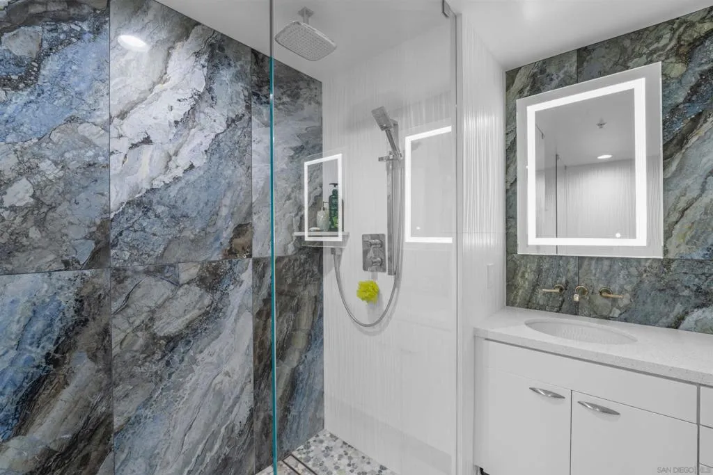 Come home to a breathtaking Downtown skyline and water views of San Diego Harbor! This highly upgraded condo in the heart of the Marina district at Renaissance Tower offers elegance, versatility, and the convenience of living right in the heart of it all. This oversized 1-bedroom residence features an open floor plan and a private balcony, offering dramatic, panoramic views. The spacious living and dining area includes a Murphy bed, providing flexibility for guests or the option to easily convert the space back into a 2-bedroom layout. The gourmet kitchen with island is ideal for hosting in the open concept living and dining room. The primary suite is a true retreat with a spa-like marble bath that serves as a striking statement piece. The suite also includes a walk-in closet and breathtaking views to wake up to every morning. Renaissance Tower offers an array of resort-style amenities, including 24-hour gated security, a front desk concierge, an event space, and fresh updates to the street-level lobby, community lounges, pool, spa, and BBQ areas. You will love being just a short stroll to restaurants, the Gaslamp, Rady’s Shell, Petco Park, Little Italy, and all of the amazing year-round events!