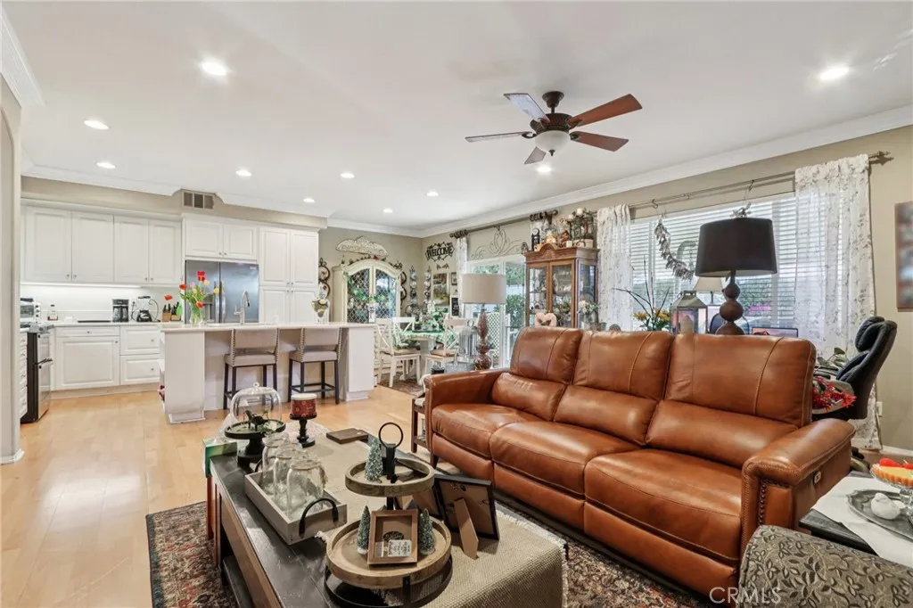 Welcome home to charming curb appeal that instantly makes you smile. From the white picket fence and mature landscaping to the warm, inviting exterior, this home makes a beautiful first impression the moment you arrive. Nestled on a quiet cul-de-sac in the highly sought-after Mapleton community, this beautifully maintained home offers the perfect blend of space, comfort, and everyday functionality with no HOA. Inside, you’ll find four generously sized bedrooms and two full bathrooms, along with a thoughtfully designed layout ideal for both daily living and entertaining. The spacious kitchen features an island with bar seating, abundant cabinet and counter space, and opens seamlessly to the inviting family room with media niches and a cozy fireplace. A formal living and dining room provide the perfect setting for hosting family and friends. The home also includes solar, a built-in office/ hallway workspace, and beautiful wood and Pergo flooring throughout, complemented by elegant crown molding. Step outside to enjoy a drought-resistant front yard and a beautifully landscaped backyard complete with multiple fruit-bearing trees, including orange and peach trees, along with an Alumawood patio cover — perfect for relaxing or entertaining year-round. A three-car garage adds extra convenience and storage. Located just steps from nearby walking trails and parks, and only minutes from shopping, dining, and everyday essentials, including Costco, Target, and Starbucks, this home also offers easy access to the 215 freeway. This charming cul-de-sac home offers comfort, space, and an unbeatable location, a wonderful place to call home.