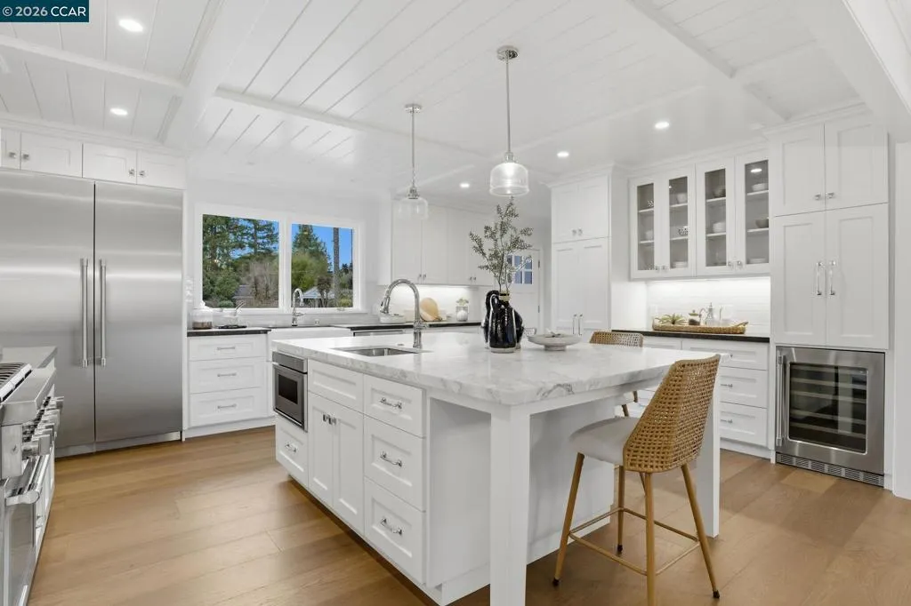 This exceptional newly constructed and reimagined estate is located on a serene cul-de-sac in the highly sought after Westside Alamo, conveniently located near tree-lined walk and bike paths and commute routes. This nearly 3,500 sf residence boasts 5 generous bedrooms and 4.5 bathrooms. The heart of the home is a spectacular chef's kitchen featuring custom cabinetry, a coffered bead board ceiling, granite countertops, an oversized center island, premium fixtures and pro-series appliances. Wide planked flooring flow throughout while the custom millwork and soaring ceilings create a perfect blend of sophistication and warmth. The open floor plan and beautiful setting make way for abundant natural light. The designer-curated finishes throughout echo modern luxury & effortless living. Moreover, this residence comes with a brand new 3 car garage and offers wonderful flexibilty with an in-law or guest quarters and separate access. Plus, this rare & professionally landscaped property sits on a FLAT 0.66 acre lot offering ample space for an ADU! This resort-like residence is ideal for a staycation and entertainment! The cherry on top is that this address feeds into the acclaimed San Ramon Valley Unified School District!