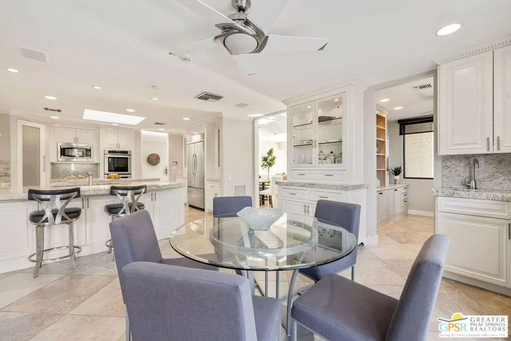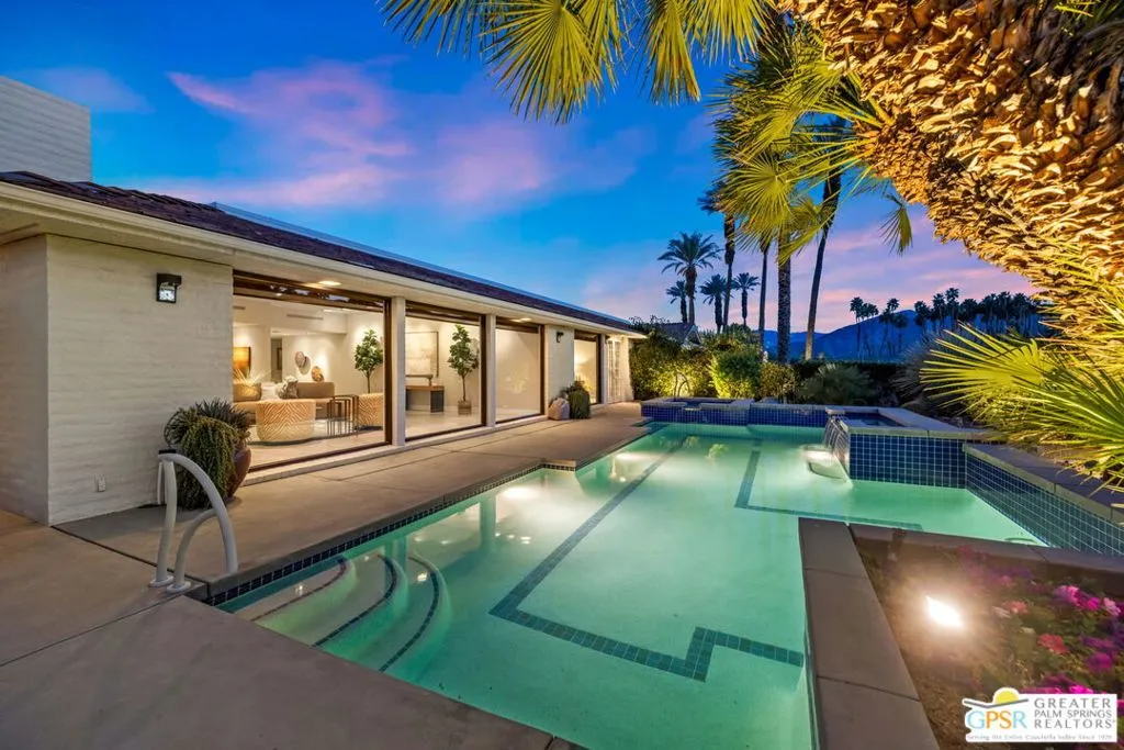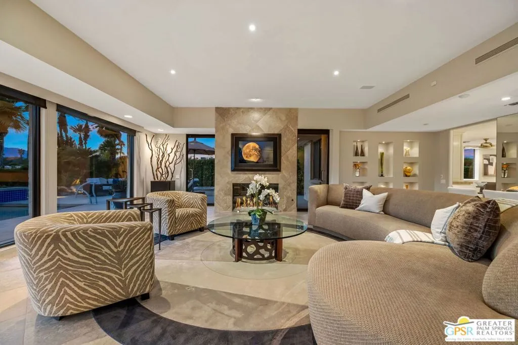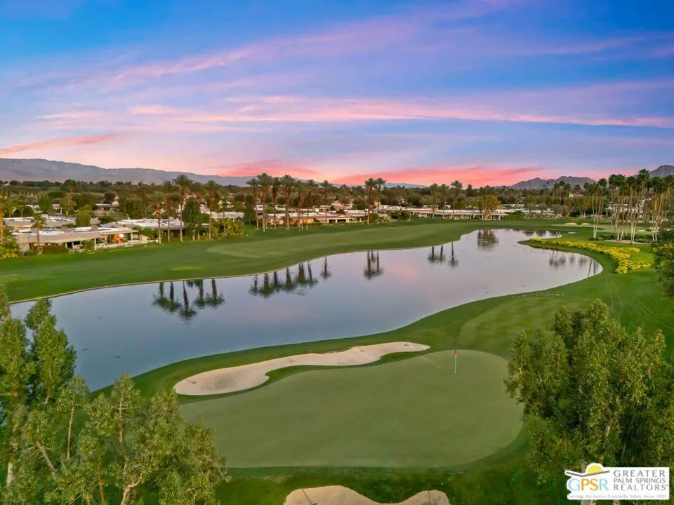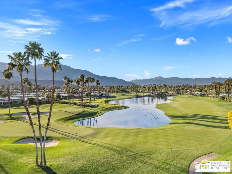 Uninterrupted, front-row views across multiple fairways, shimmering lake, and the Santa Rosa and San Jacinto mountains define this expanded and highly customized Oakmont 4 residence at The Club at Morningside. Formerly owned by actor and singer Buddy Rogers, the 3 bedroom + office, 3.5 bath home blends Hollywood heritage with the refined lifestyle of one of Rancho Mirage's most respected private clubs. Positioned at the end of a quiet cul-de-sac, the setting delivers privacy, scale, and a memorable sense of arrival. A formal gallery-style entry opens to a voluminous living space where floor-to-ceiling windows immediately capture the sweeping landscape beyond. The south-west facing formal living and dining area is anchored by a striking fireplace and dual glass doors that extend the living experience to layered outdoor spaces designed for both entertaining and quiet desert evenings. The adjacent kitchen, casual dining area, and family room continue the indoor-outdoor connection through a series of French doors opening to the patio. Skylights, a generous island, and a built-in appliance suite enhance both function and natural light. A dedicated office enjoys views, providing an inspiring setting for work or creative pursuits. The Primary Suite offers a retreat-like atmosphere with panoramic views and direct access to the backyard pool and spa. The ensuite bath features dual sinks, soaking tub, walk-in shower, and two cedar-lined closets. Junior Ensuite Two is thoughtfully positioned for privacy, while Junior Ensuite Three includes its own retreat, private patio, walk-in closet, and ensuite bath. A powder bath, inside laundry, and direct access to a two-car plus golf-cart garage complete the interior. Recent improvements include fresh interior paint and newly installed HVAC systems. Ownership at Morningside offers access to an optional membership experience within a private equity club known for its lush landscaping, vibrant seasonal color, and exceptional location in the heart of Rancho Mirage. A rare opportunity to enjoy commanding views, generous scale, and timeless club living in one of the desert's most beautiful communities.