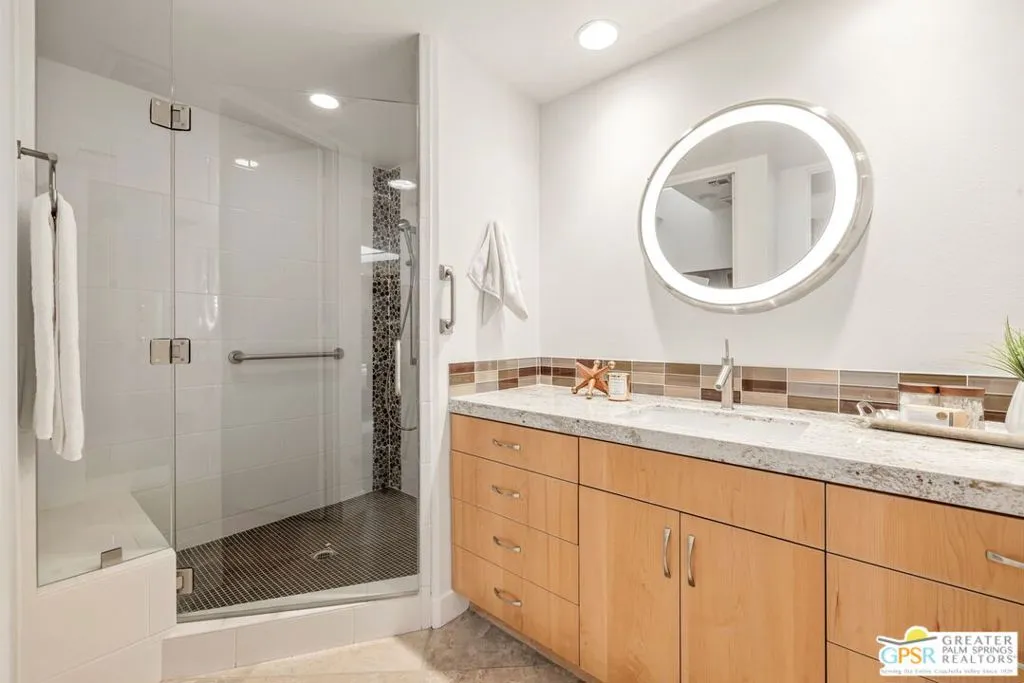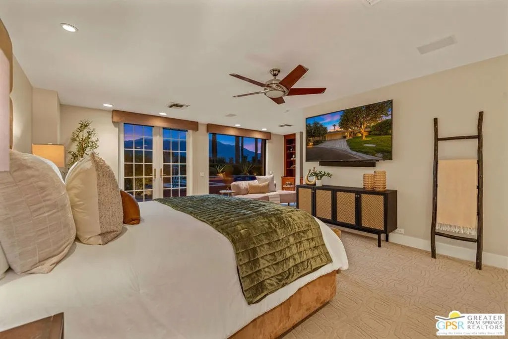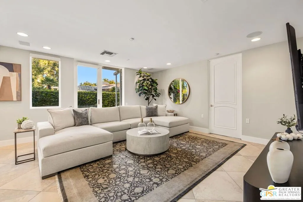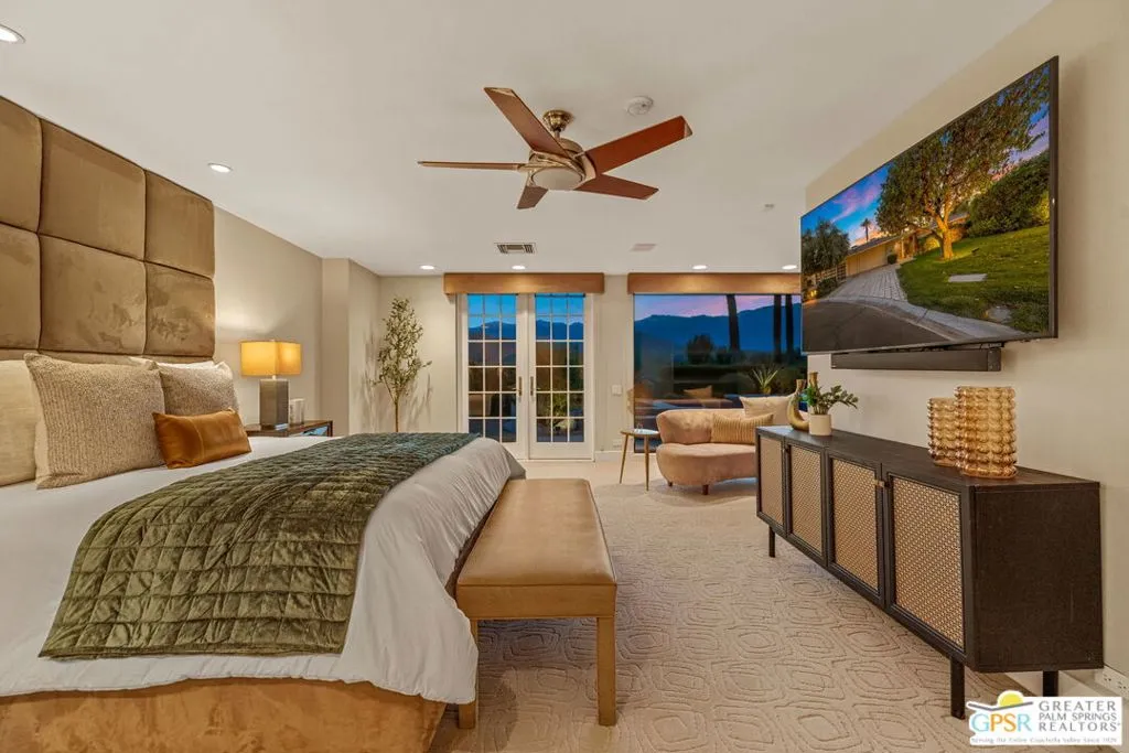 Uninterrupted, front-row views across multiple fairways, shimmering lake, and the Santa Rosa and San Jacinto mountains define this expanded and highly customized Oakmont 4 residence at The Club at Morningside. Formerly owned by actor and singer Buddy Rogers, the 3 bedroom + office, 3.5 bath home blends Hollywood heritage with the refined lifestyle of one of Rancho Mirage's most respected private clubs. Positioned at the end of a quiet cul-de-sac, the setting delivers privacy, scale, and a memorable sense of arrival. A formal gallery-style entry opens to a voluminous living space where floor-to-ceiling windows immediately capture the sweeping landscape beyond. The south-west facing formal living and dining area is anchored by a striking fireplace and dual glass doors that extend the living experience to layered outdoor spaces designed for both entertaining and quiet desert evenings. The adjacent kitchen, casual dining area, and family room continue the indoor-outdoor connection through a series of French doors opening to the patio. Skylights, a generous island, and a built-in appliance suite enhance both function and natural light. A dedicated office enjoys views, providing an inspiring setting for work or creative pursuits. The Primary Suite offers a retreat-like atmosphere with panoramic views and direct access to the backyard pool and spa. The ensuite bath features dual sinks, soaking tub, walk-in shower, and two cedar-lined closets. Junior Ensuite Two is thoughtfully positioned for privacy, while Junior Ensuite Three includes its own retreat, private patio, walk-in closet, and ensuite bath. A powder bath, inside laundry, and direct access to a two-car plus golf-cart garage complete the interior. Recent improvements include fresh interior paint and newly installed HVAC systems. Ownership at Morningside offers access to an optional membership experience within a private equity club known for its lush landscaping, vibrant seasonal color, and exceptional location in the heart of Rancho Mirage. A rare opportunity to enjoy commanding views, generous scale, and timeless club living in one of the desert's most beautiful communities.