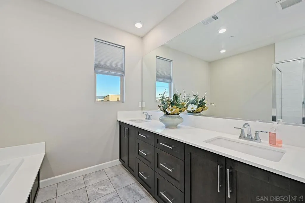 Located in the heart of Millenia, San Diego’s newest master-planned urban destination, this beautifully finished corner residence is truly turnkey. Thoughtfully designed for modern living, this tri-level townhome is filled with natural light and enhanced by energy-efficient solar, upgraded flooring throughout, and plush carpet upstairs for added comfort, along with smart-home features tailored to today’s lifestyle. The kitchen serves as the centerpiece of the home, showcasing warm shaker cabinetry, crisp quartz countertops, a classic subway tile backsplash, stainless steel appliances, a gas cooktop, pantry storage, and a generous island ideal for casual dining or entertaining. A private balcony extends the living space outdoors, while the flexible floor plan includes a full bedroom and bathroom on the main level—perfect for guests, a home office, or multigenerational living. Enjoy effortless access to nearby parks, resort-style pools, and all the conveniences that make Millenia one of San Diego’s most exciting neighborhoods. This is modern living at its best in a vibrant, walkable community. FHA and VA–approved complex.