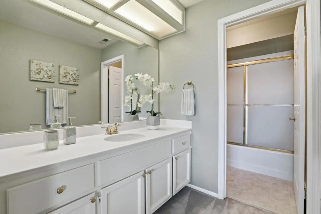 Experience this unique two-story, 2.5-bath villa in the sought-after 55+ Villages Golf & Country Club, featuring a flexible floor plan with dual primary suites and exceptional pond views. Perfectly oriented to capture peaceful vistas of the three-fountain pond, the Foothills, and breathtaking sunsets from the back patio, its quiet cul-de-sac location and gated front courtyard ensure maximum privacy. Inside, enjoy seamless main-level living with a vaulted-ceiling living room, updated kitchen, primary suite, office and guest bathroom. The upper-level suite offers a private, refined sanctuary that provides an elevated sense of separation and comfort. Residents enjoy 24-hour security, fitness center, pickleball, tennis, bocce, 18-hole golf, four pools, hot tubs, private hiking trails, and over 60 clubs. This unique villa offers the ultimate blend of tranquility, privacy, and extraordinary water views for optimal, resort-style living