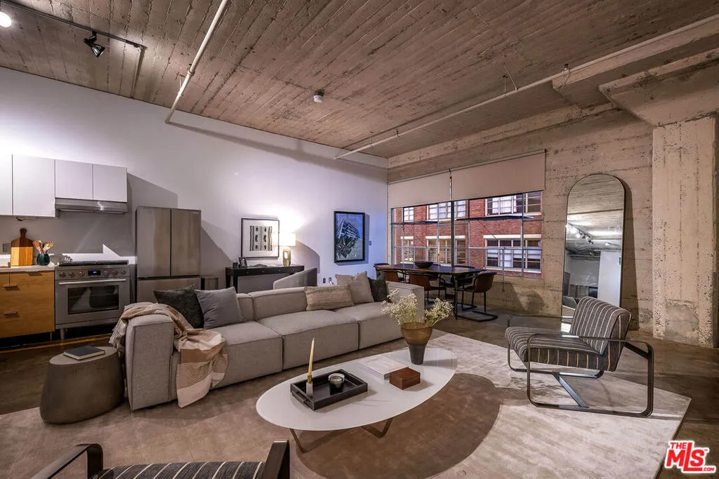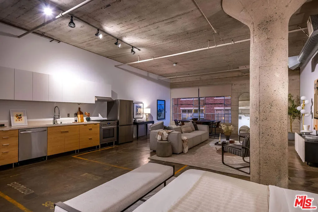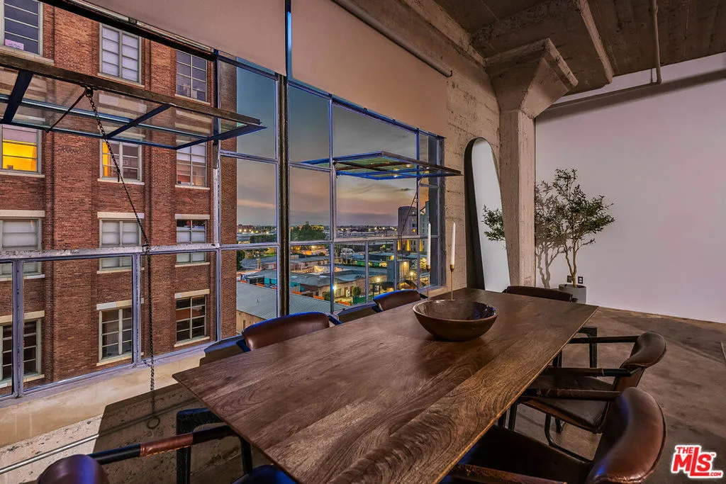 Toy Factory Lofts, a highly coveted Live/work loft community in the vibrant Arts District of DTLA. This remarkable Penthouse loft, a rare find, boasts an expansive open floor plan with soaring 12-foot ceilings. Original 1924 concrete floors and columns combine historic features with modern living. The loft is illuminated by oversized industrial-style windows, recently upgraded with new glass and motorized shades, facing south to invite abundant of natural light throughout the space. Recent upgrades include kitchen appliances: a Bosch gas stove, Samsung refrigerator and dishwasher, and a large LG front loading stackable washer-dryer. Resort like building amenities enhance the living experience, offering a secure lobby with a 24-hour doorman, a rooftop pool surrounded by a sun deck and a cozy fire pit that provides breathtaking views of the DTLA skyline, 6th Street Bridge, and snow capped mountains. Enjoy a communal deck with lush green spaces, barbecue areas, and a two-story gym. Residents benefit from an assigned, indoor, secured parking space in the attached private garage. Toy Factory Lofts is located just steps away from Hank's Organic Market, restaurants like Camila, Bestia, Bavel, The Soho House, DTLA Row Factory, The Bike Shed Moto Co, and galleries including Hauser & Wirth, ICA LA and many more. It is also located 2 blocks from Warner Music and Spotify offices with easy access to the 5, 10 & 101 FWYS. This penthouse loft offers the ultimate freedom to live, create, and work from home in a true industrial-chic settinga rare opportunity in one of DTLA's most iconic buildings.