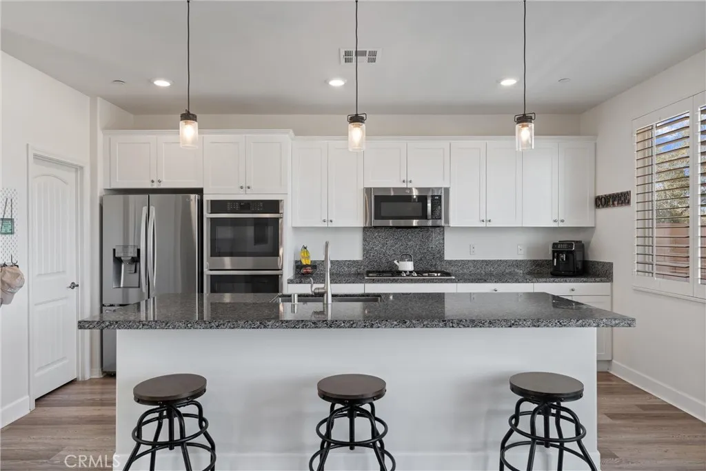 Introducing a residence where modern design, thoughtful upgrades, and unforgettable VIEWS create an exceptional living experience in the Sycamore Creek community. Set on a prime elevated corner lot with only one neighbor next to you this 4-bedroom, 3-bath home immediately impresses with its curated finishes—luxury vinyl plank flooring, detailed millwork, designer lighting, shutters, and upgraded baseboards. The heart of the home is a bright, inviting kitchen featuring island seating, a gas range, dual ovens, walk-in pantry, and effortless flow to the backyard through sliding glass doors. Step outside to enjoy Trex decking, custom turf, and sweeping mountain and canyon scenery—a perfect setting for quiet mornings or weekend gatherings. Inside, soaring ceilings rise nearly 20 feet, leading to an upstairs loft ideal for media, lounging, or play. A spacious laundry room with upgraded tile and generous storage sits near two secondary bedrooms and a full bath. The primary suite captures the home’s best views and includes a custom accent wall, dual sinks, makeup vanity, soaking tub, walk-in shower, and a large closet. An oversized garage provides room for large vehicles, tools, storage, and more. Energy-efficient features include solar panels, a tankless water heater, and a whole-house fan. Residents enjoy premier community amenities: pools, splash pad, fitness center, sports courts, dog park, and just around the corner you have access to the Deleo Regional Park which features a skate park, BMX track, trails, multiple parks, tennis & pickleball courts—all just minutes from shopping, dining, schools, and freeway access. A truly standout offering in Sycamore Creek.