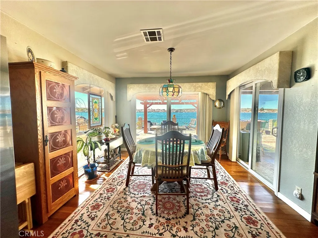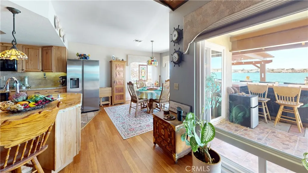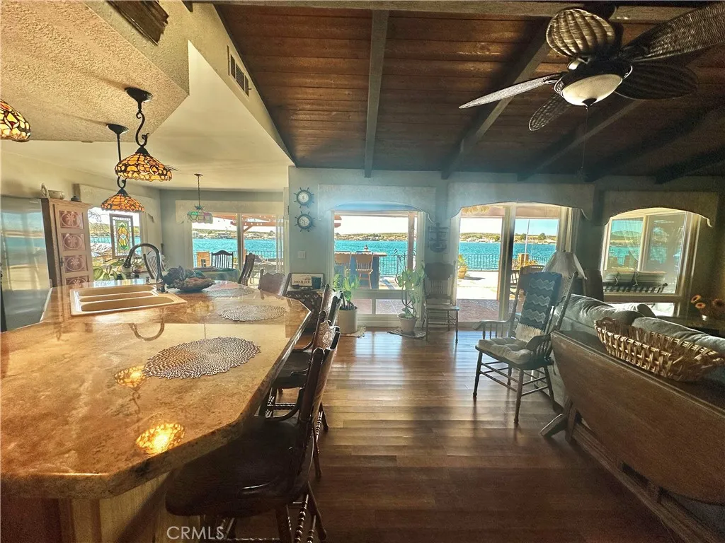 *JUST LISTED!* Encounter stunning sunset views on the OPEN WATER every evening from your back patio. If you have been looking for a house right on the lake, this may be the one. This charming 2 bedroom 2 bath home features a delightful courtyard entry area and a perfect layout with each bedroom and bath on separate sides of the home. The living room boasts gorgeous vaulted wood beam ceilings and a grand brick fireplace that looks out to glimmering lake views. It is truly an entertainer’s kitchen with custom tiling and oak cabinetry throughout. The dining area looks out onto the lake with 180 degree views and sliding glass doors all around for easy access to the back patio. The primary suite is exquisite, with spacious walk-in closet, custom shower and heated floors in the bathroom, sliding doors to patio, it’s own heating and cooling unit, and phenomenal water views every time you wake up. Lush landscaping and roses set the tone of the patio seating area in your new backyard paradise, ready for barbecues and entertaining. Mature olive, avocado, apple, cherry plum, and crepe myrtle trees surround the property and fresh star jasmine and lemon verbena are planted to delight your senses. The backyard includes it’s own fenced in access to private dock on the water and boat launch! Aside from the great features at the house, you’ll also gain access to all of the wonderful community amenities of Silver Lakes including 27-hole championship golf course, pool, jacuzzi, tennis, pickle ball, and volleyball courts, outdoor recreation parks and fields, library, gym, equestrian center, and members only lake access.