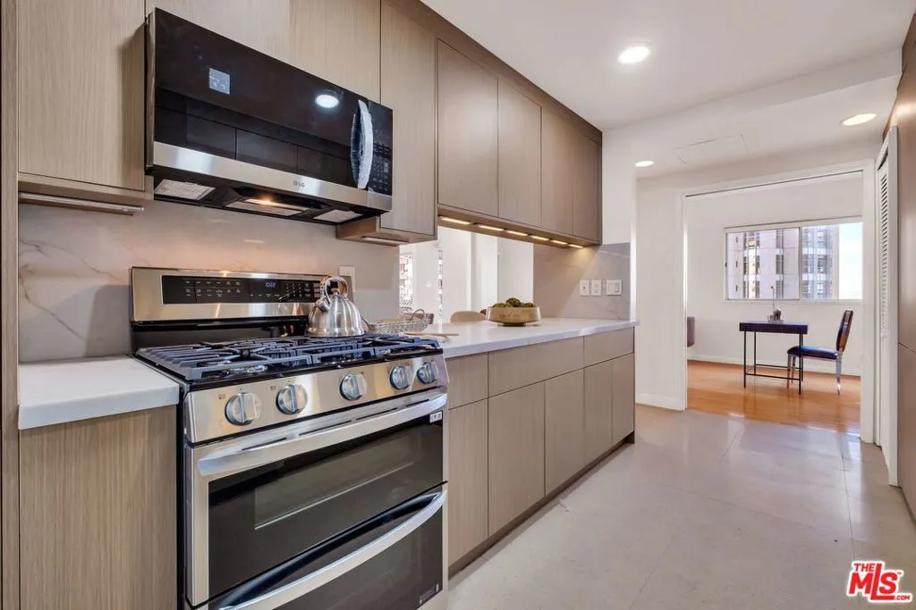 Rare offering along the prestigious Wilshire Corridoran expansive, turnkey residence showcasing sweeping skyline views and presenting an exceptional opportunity that will not last long.An elegant, light-filled residence offering sweeping city skyline and architectural high-rise views. This expansive 2-bedroom, 2-bath + den home spans approximately 1,450+ sq ft and can easily be converted back to a 3-bedroom layout, creating a rare and exceptional opportunity in one of the Corridor's desirable full-service buildings.The brand-new turnkey kitchen with breakfast bar showcases stone countertops, custom cabinetry, and brand-new appliances, seamlessly flowing into the expansive living and dining areas ideal for both everyday living and entertaining. Floor-to-ceiling glass doors open to a large private balcony overlooking surrounding high-rises and sparkling city viewsstriking by day and beautifully illuminated at night.The spacious primary suite features a generous walk-in closet and en-suite bath. A well-sized second bedroom is complemented by an updated secondary bath, while the versatile den is ideal for a home office, media room, or optional third bedroom. In-unit laundry completes the home.Ideally located just moments from Century City, Westwood Village, and University of California, Los Angeles, this full-service building offers 24-hour valet, doorman, concierge, security, and on-site management.HOA dues include all utilities except cable and internet. The elevator upgrade assessment of $237.05 per month will be completed by April 2026 and will be paid in full by the seller.This rare offering on the Wilshire Corridor presents an exceptional opportunity and will not last long.
