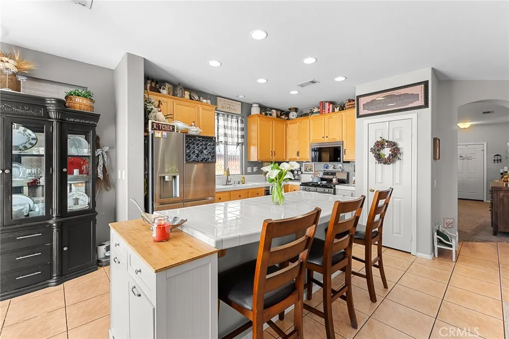 Charming and immaculate single story located in the desirable Moreno Valley Ranch located on a quiet street near schools and parks This home is filled with lots of natural light, has an open floor plan and is an entertainer's delight. Oversized kitchen with 2 nice sized pantries, upgraded cabinets and huge island that overlooks the family/great room with a cozy fireplace that leads to the outside backyard/patio and includes a built-in gas barbeque. Dual pane windows and ceiling fans throughout plus patio doors with built-in micro mini integrated blinds and french doors in primary bedroom Tile flooring in great room and kitchen. Newer stove with built in air fryer, dishwasher and microwave less than a year old. Beautiful custom front door with tempured glass. Newer neutral carpet and luxury vinyl plank flooring. Newly planted grass in front yard Moreno Valley Ranch HOA includes a long list of amenities including fishing lake, club house, swimming pools, picnic areas, gym, more! VERY LOW HOA AND NO MELLO ROOS. WELCOME HOME!